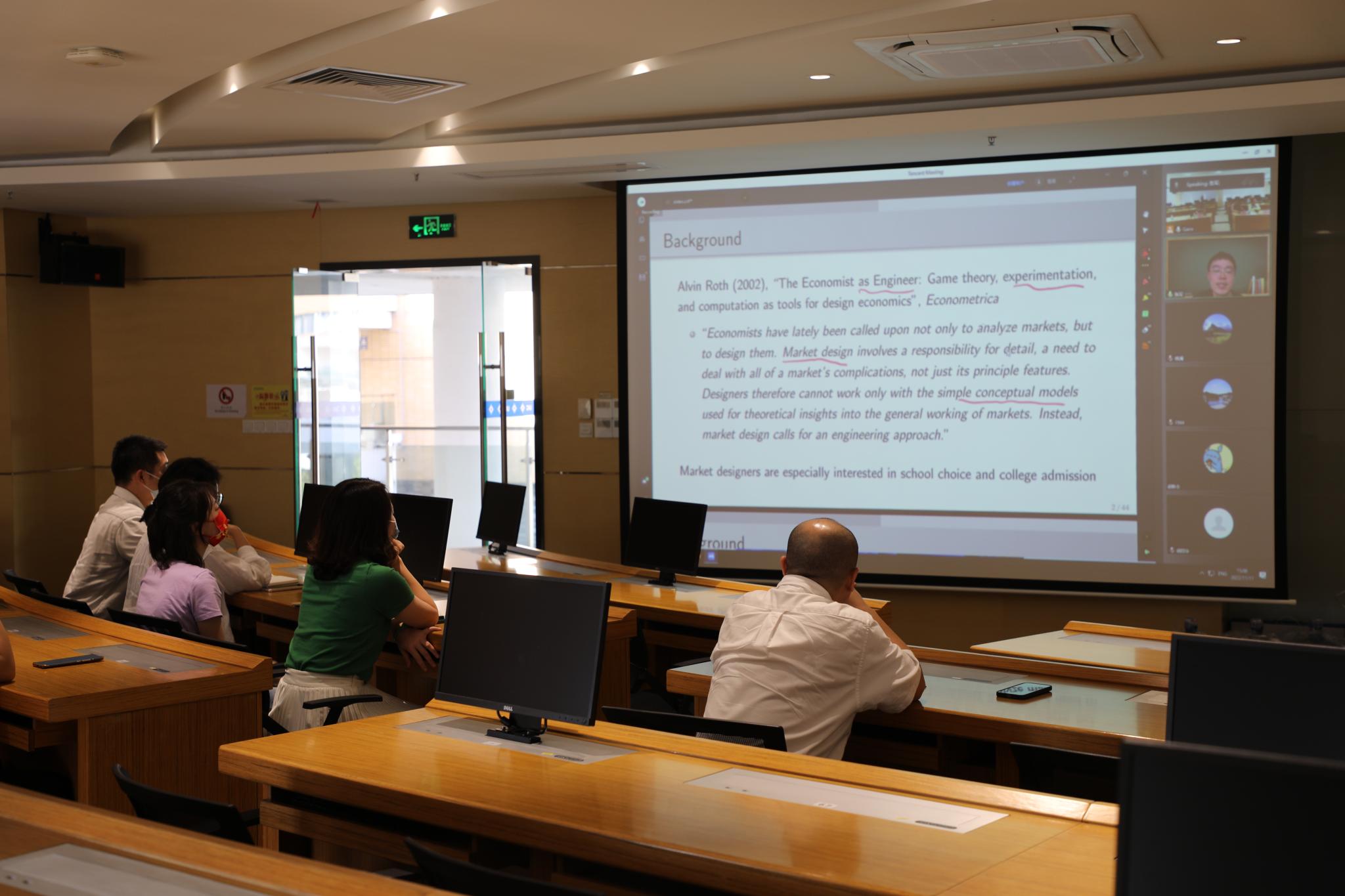 张军教授首先向大家介绍了此项研究的背景,目的与意义。张军教授介绍道:该研究证明了两步录取机制的缺陷,改进为将两步合并为一步,并扩展分析新高考改革。结合几个例子,张军教授接着介绍了中国平行志愿机制CPM及其低效的缺陷,提出改进平行志愿机制RPM,在检查学生排名表的同时决定他的录取院校和专业。RPM能避免CPM中所出现的排名浪费和结果嫉妒现象,并给学生提供专业调剂选择的正确激励。通过设计实验,对比CPM和RPM在院校优先、专业优先以及平衡选择的三类学生中的影响,张军教授验证了RPM在专业调剂,效率以及公平上的提高。实现了平均回报和排名顺序的正相关。最后张军教授讨论了新高考改革,分别列举了以浙江省为代表的专业平行机制IPM,和以上海市为代表的院校专业组平行机制GPM。通过实验结果比较,进一步验证了一步录取机制的优越性。