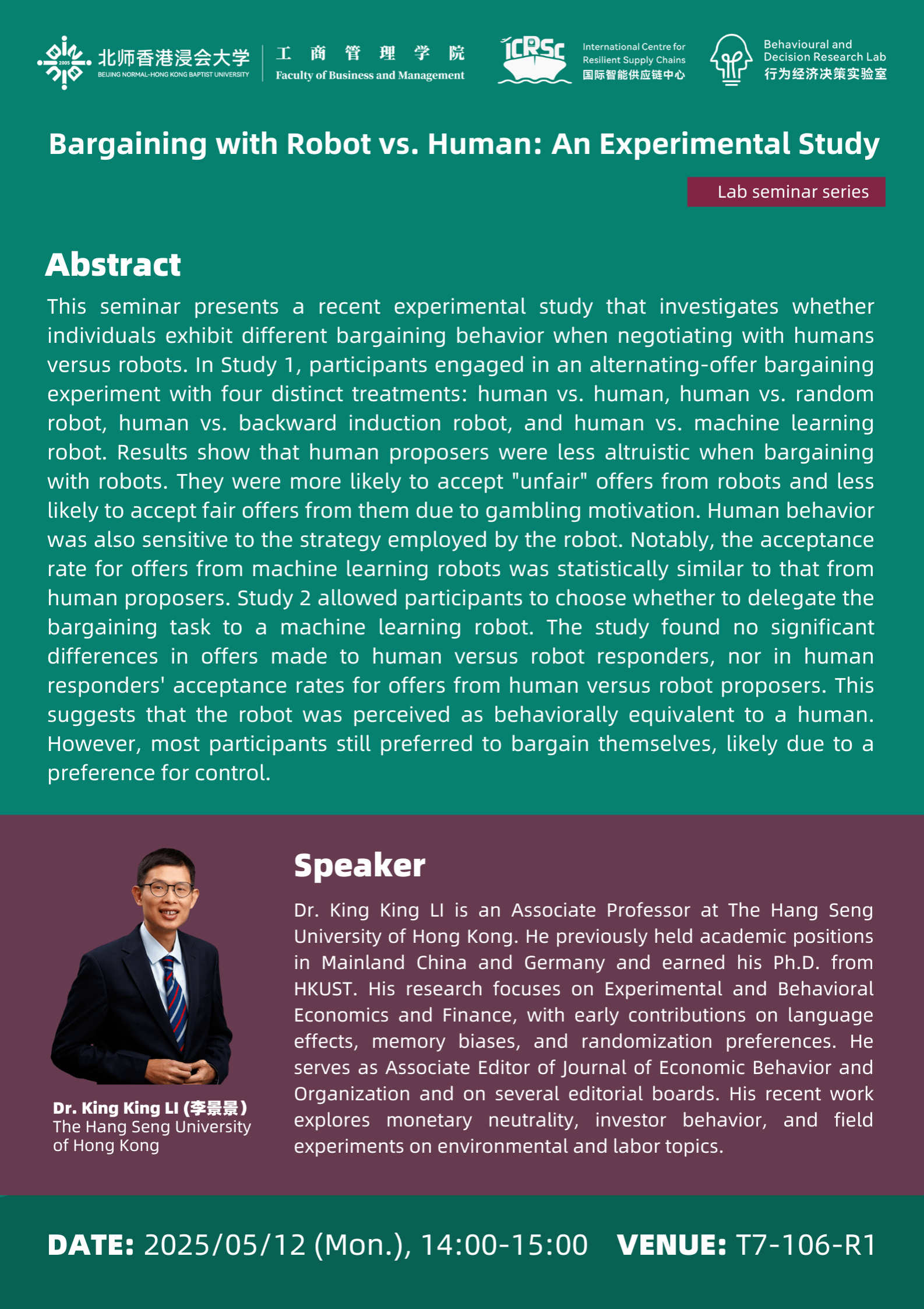 Li King King is an Experimental Economist. He is currently an associate professor at The Hang Seng University of Hong Kong. Previously, he was on the faculty of Shenzhen University, City University of Hong Kong, Shanghai University of Finance and Economics, and postdoc with Werner Güth at Max Planck Institute of Economics in Germany. He received his PhD in Economics from HKUST with Chew Soo Hong as his advisor.
