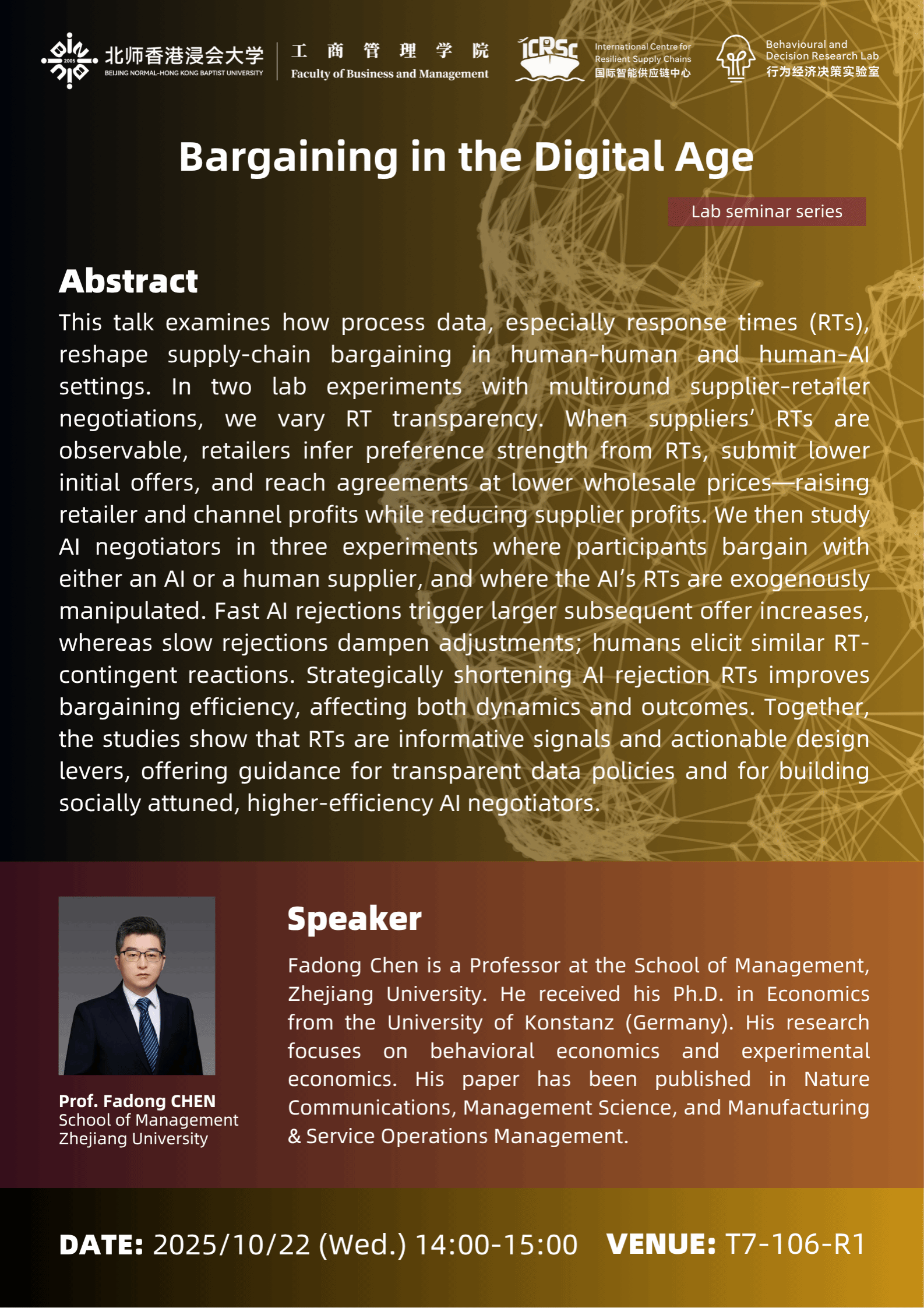 This talk examines how process data, especially response times (RTs), reshape supply-chain bargaining in human–human and human–AI settings. In two lab experiments with multiround supplier–retailer negotiations, we vary RT transparency. When suppliers’ RTs are observable, retailers infer preference strength from RTs, submit lower initial offers, and reach agreements at lower wholesale prices—raising retailer and channel profits while reducing supplier profits. We then study AI negotiators in three experiments where participants bargain with either an AI or a human supplier, and where the AI’s RTs are exogenously manipulated. Fast AI rejections trigger larger subsequent offer increases, whereas slow rejections dampen adjustments; humans elicit similar RT-contingent reactions. Strategically shortening AI rejection RTs improves bargaining efficiency, affecting both dynamics and outcomes. Together, the studies show that RTs are informative signals and actionable design levers, offering guidance for transparent data policies and for building socially attuned, higher-efficiency AI negotiators.