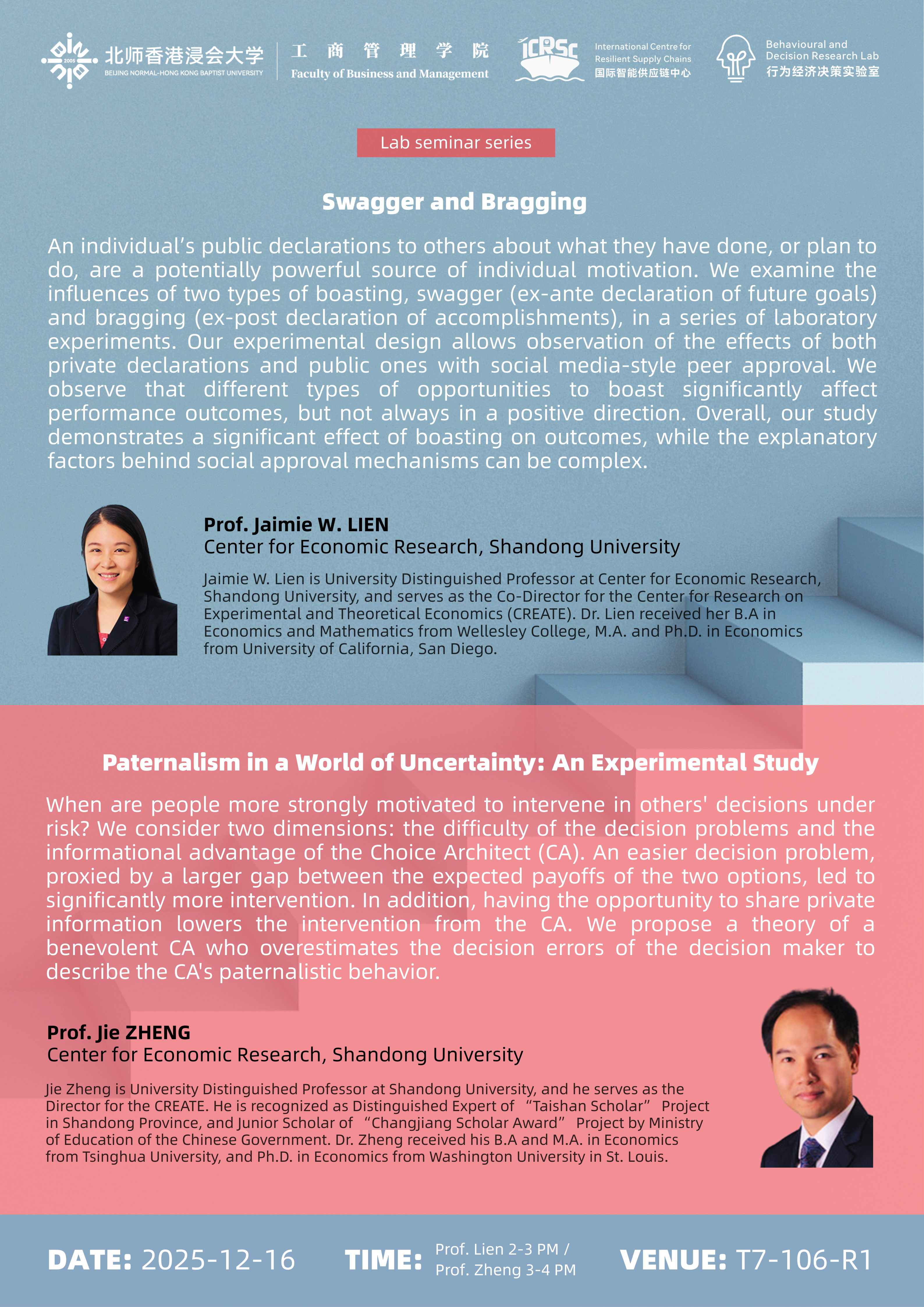 Speaker:Prof. Jie ZHENG, Center for Economic Research, Shandong University