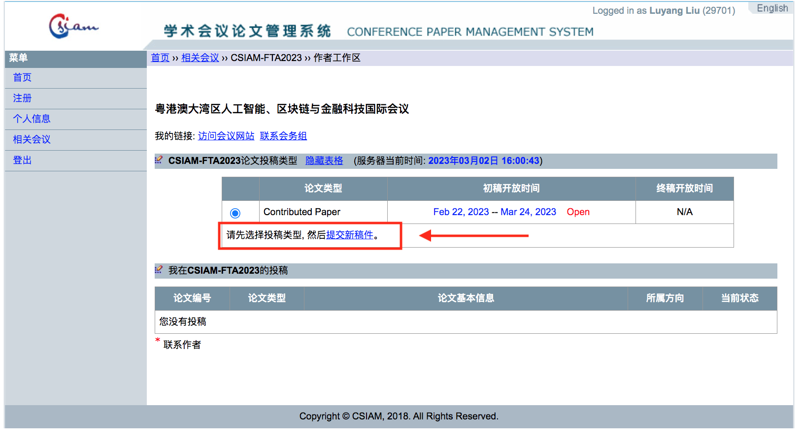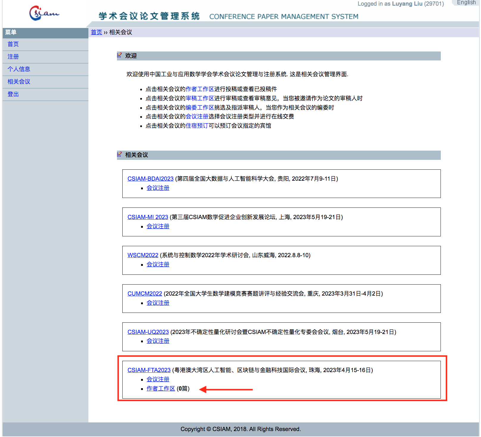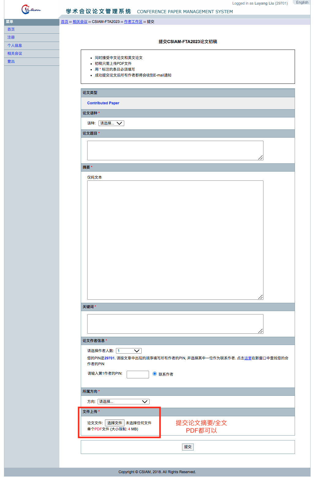 登录会议注册网址:https://s.csiam.org.cn/ ,注册登录后,选择CSIAM-FTA2023,点击“作者工作区”进入投稿系统,点击“提交新稿件”进入投稿页面(会议同时接受中英文稿件),文件上传处可提交全文或摘要PDF;在线提交摘要的截止日期为2023年04月03日。论文将由国际学者组成的评审委员会进行评选,并计划于2023年04月07日前通知作者接受情况。