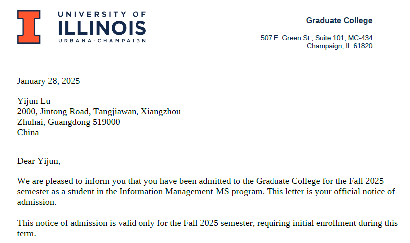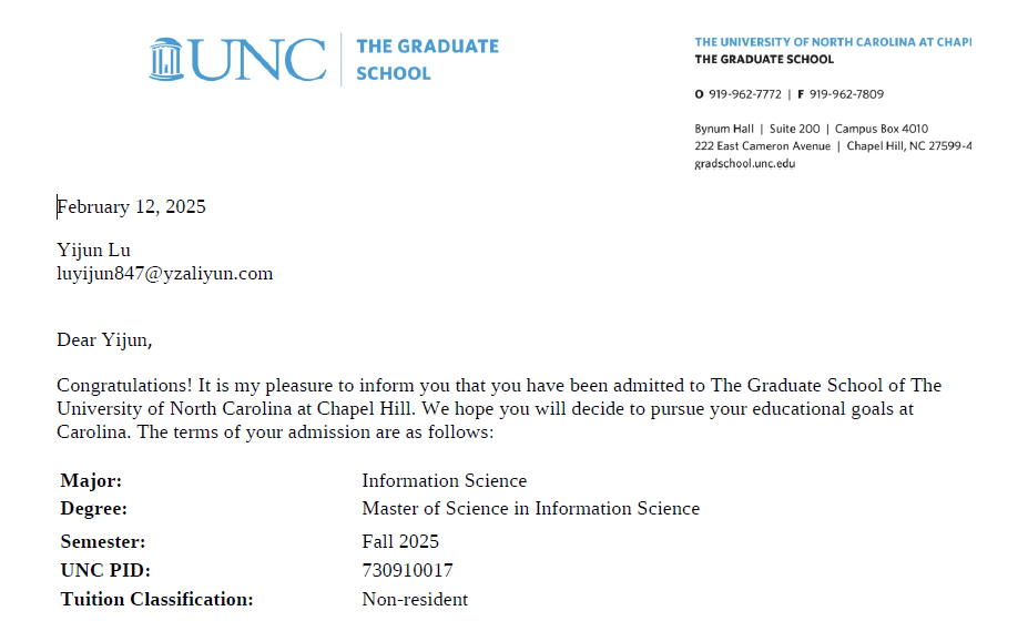 逆袭!从GPA 2.77到3.81,电子商务与资讯系统管理陆一骏,斩获两所公立常春藤名校录取——全美信息系统TOP10的伊利诺伊大学厄巴纳香槟分校和美国"公立大学鼻祖"北卡罗来纳大学教堂山分校。