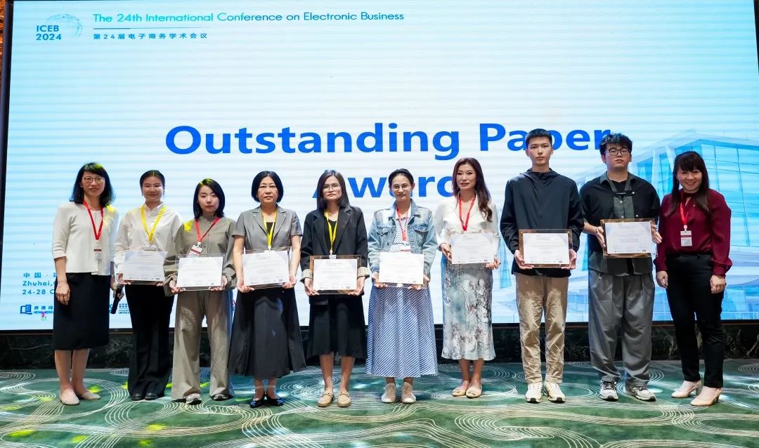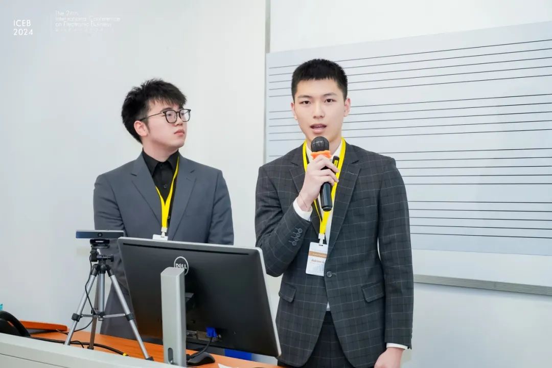 图为陆一骏在 The 24th International Conference on Electronic Business第二十四届国际电子商务会议作学术报告