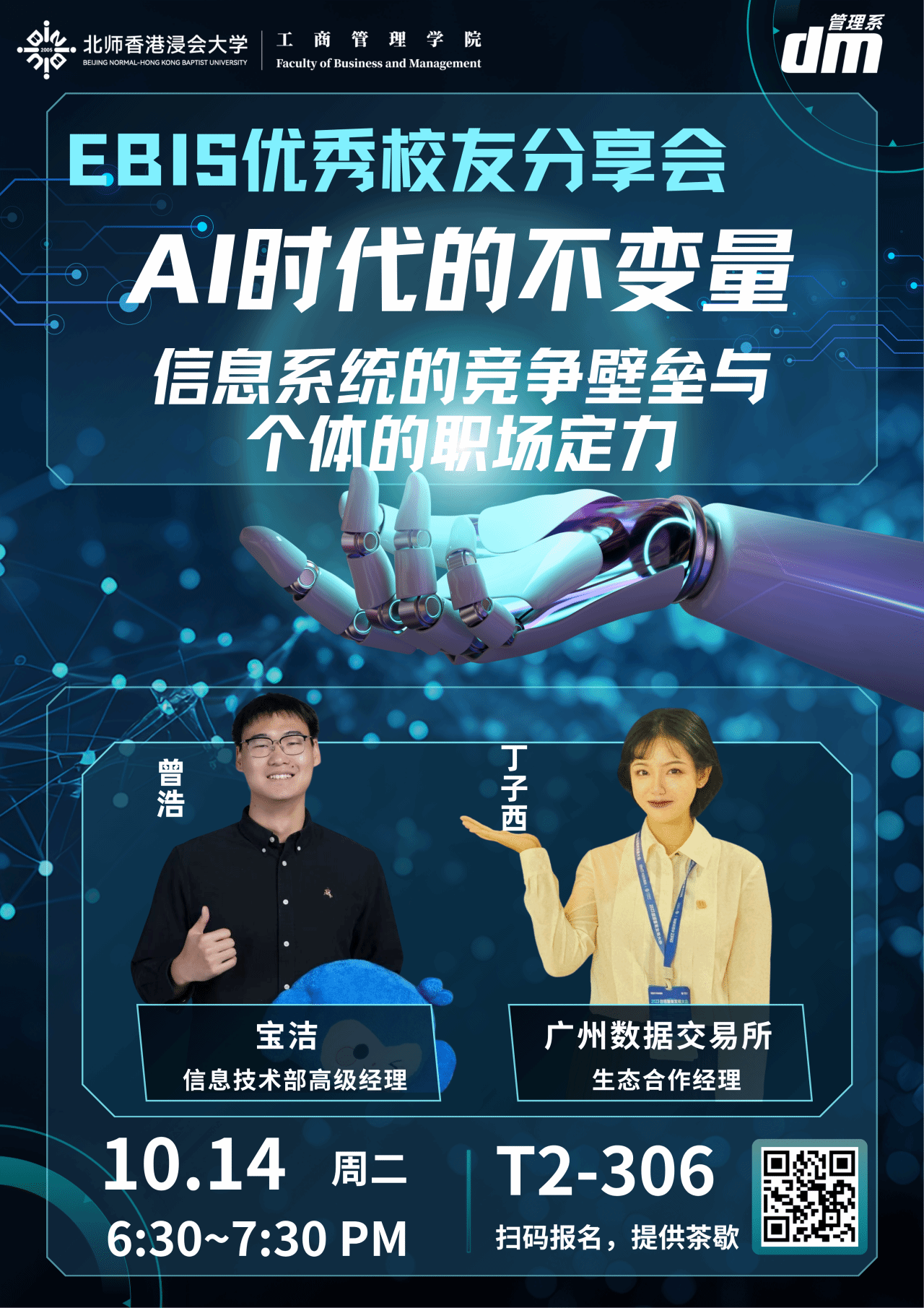 10月14日,工商管理学院管理系将举办“EBIS优秀校友分享会”,两位行业精英校友带着实战经验回归,为你解锁AI时代的职业成长新范式。