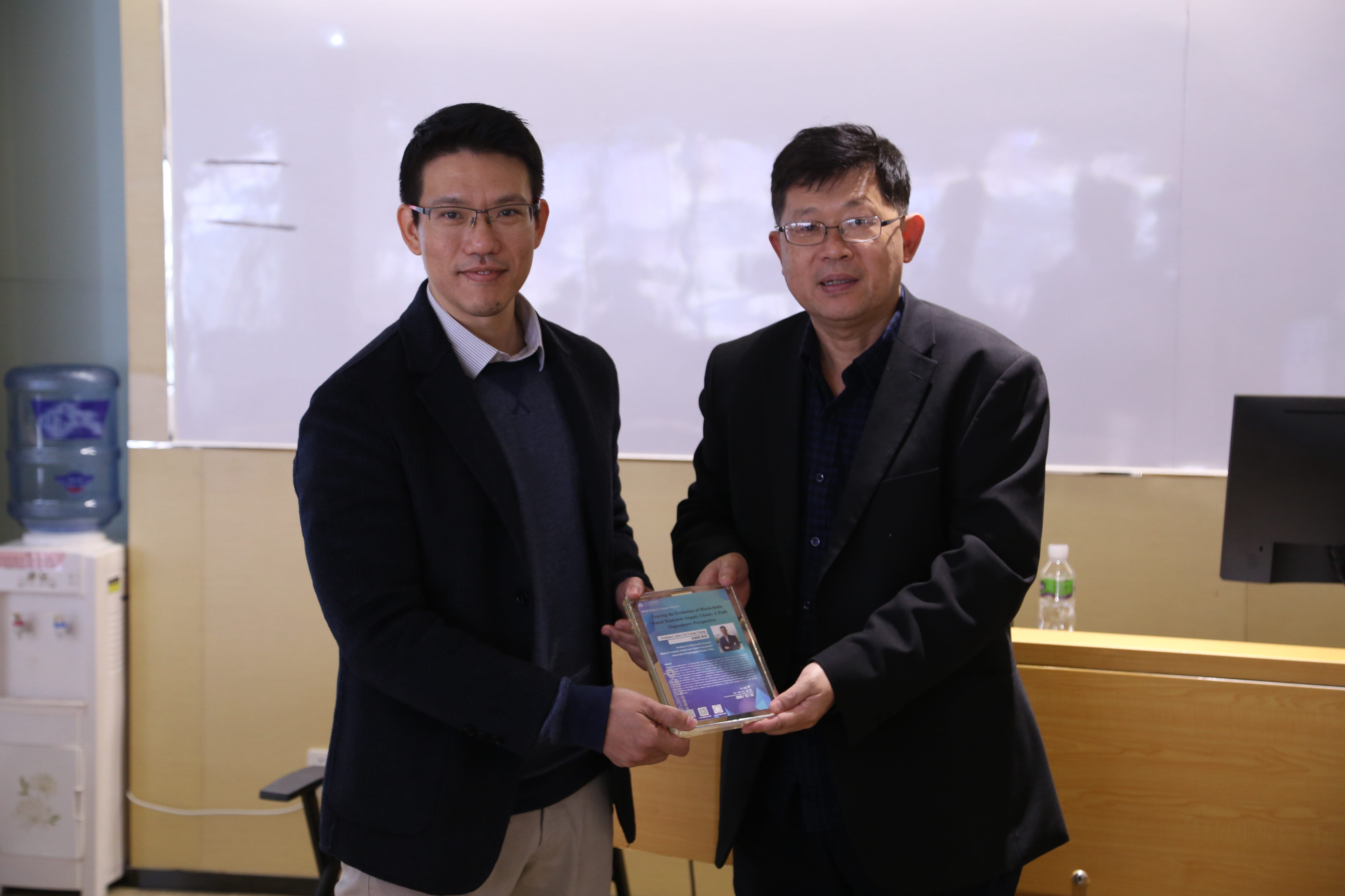 Prof. Wenbin Liu (right) presents a souvenir to Prof. Alian Chong
