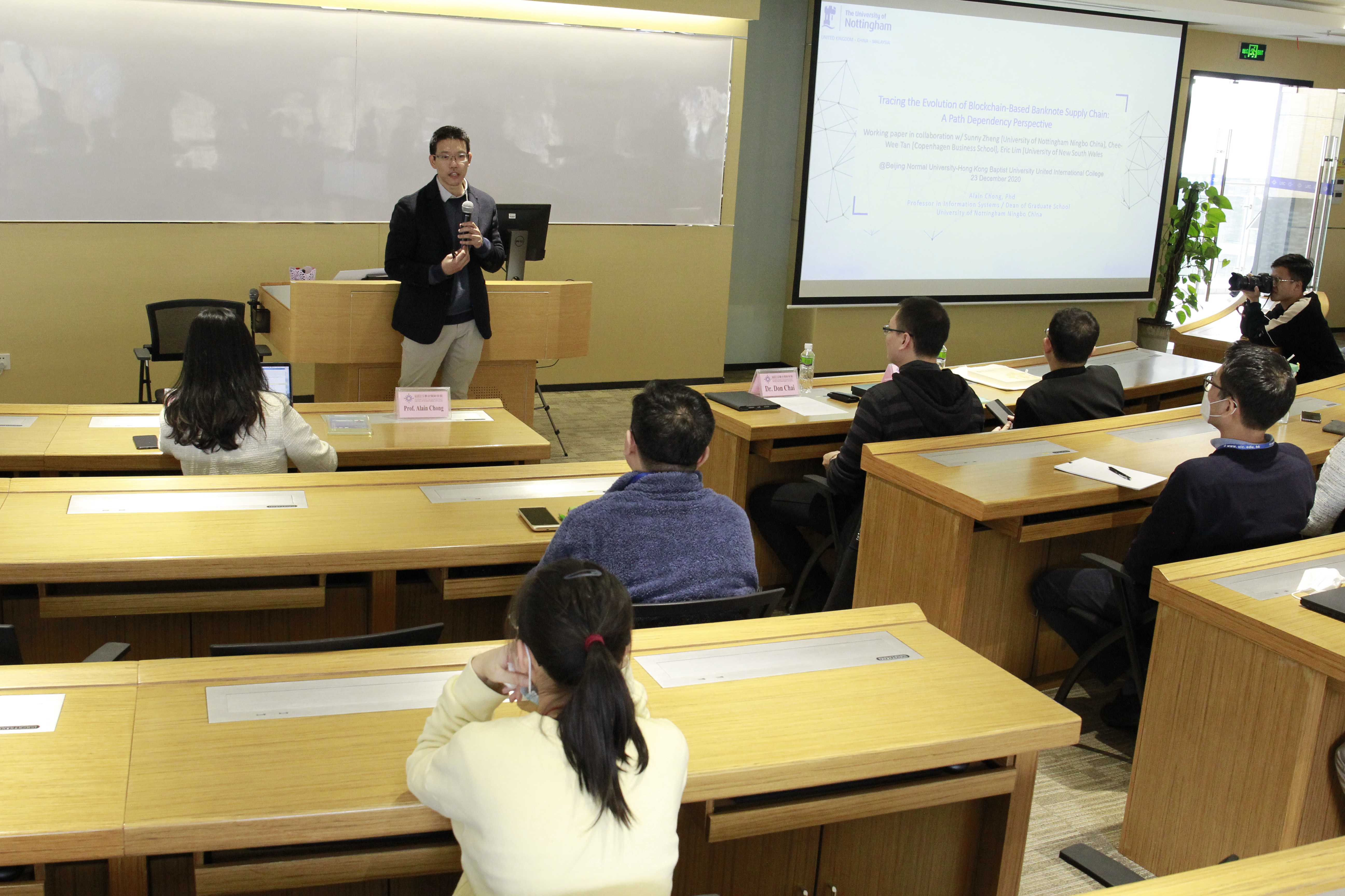 On 23 December 2020, invited by the Division of Business and Management, Professor Alian Chong, Professor in Information Systems, Dean of Graduate School and Global Engagement, University of Nottingham Ningbo China, delivered a lecture titled “Tracing the Evolution of Blockchain-Based Banknote Supply Chain: A Path Dependency Perspective” to DBM staff.
