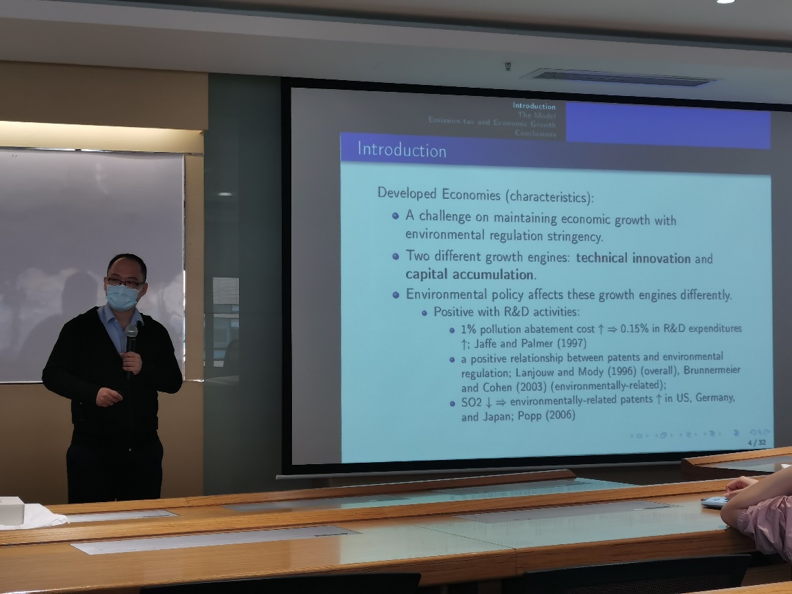 In the lecture, Dr. Yang introduced his paper to our academic staff. His paper investigates environmental regulations in an endogenous growth model that features two engines of growth -- perpetual capital and innovation growth. They provide a theoretical (both analytical and numerical) analysis to sharpen the empirical observations on the distinctive responses of innovation and capital accumulation to environmental policy stringency. Analytically, they found that environmental regulations (pollution taxes) can result in an increase in innovation growth and a decrease in capital growth, provided that dirty inputs and capital are sufficiently complementary. The contrasting responses of the two growth engines lead to an inverted-U relationship between the overall GDP growth and environmental taxation. Thus, there exists a double-dividend in terms of not only improving the environment (the environmental green dividend) but also increasing economic growth and social welfare (the non-environmental blue dividend).