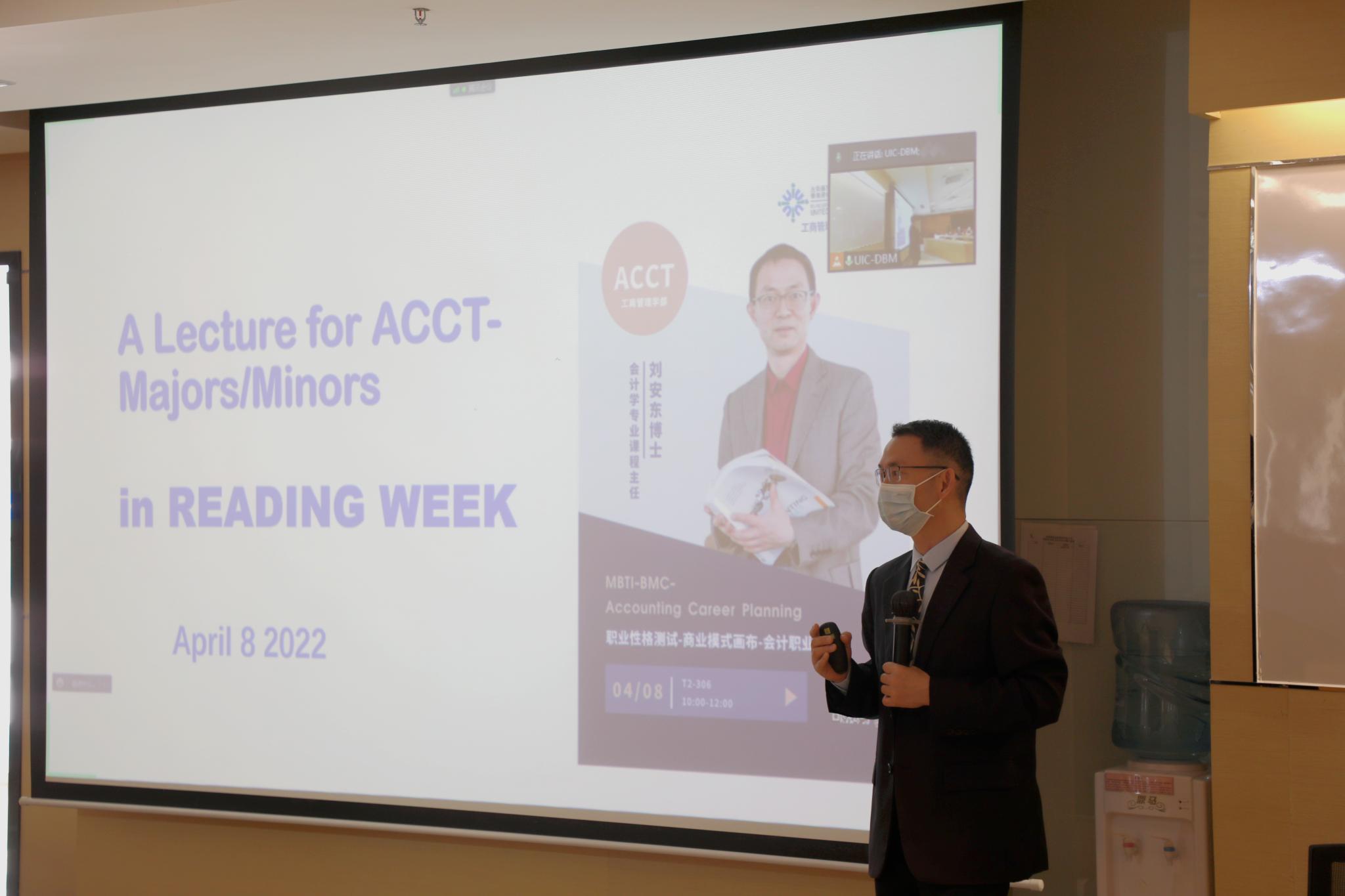 On the morning of April 8th, Dr. Anthony Liu, director of accounting program, gave lectures themed "Career Personality Test - Business Model Canvas - Career Path for Accounting" to students majoring/minoring in accounting.