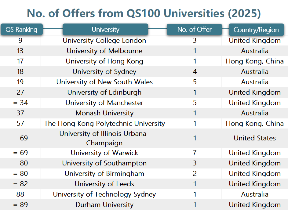 This year's cohort achieved a QS30 (world's top 30 universities) admission rate of 47%, maintaining a high level of success. Notably, the QS100 admission rate reached 93%, marking the second consecutive year it has exceeded 90%.