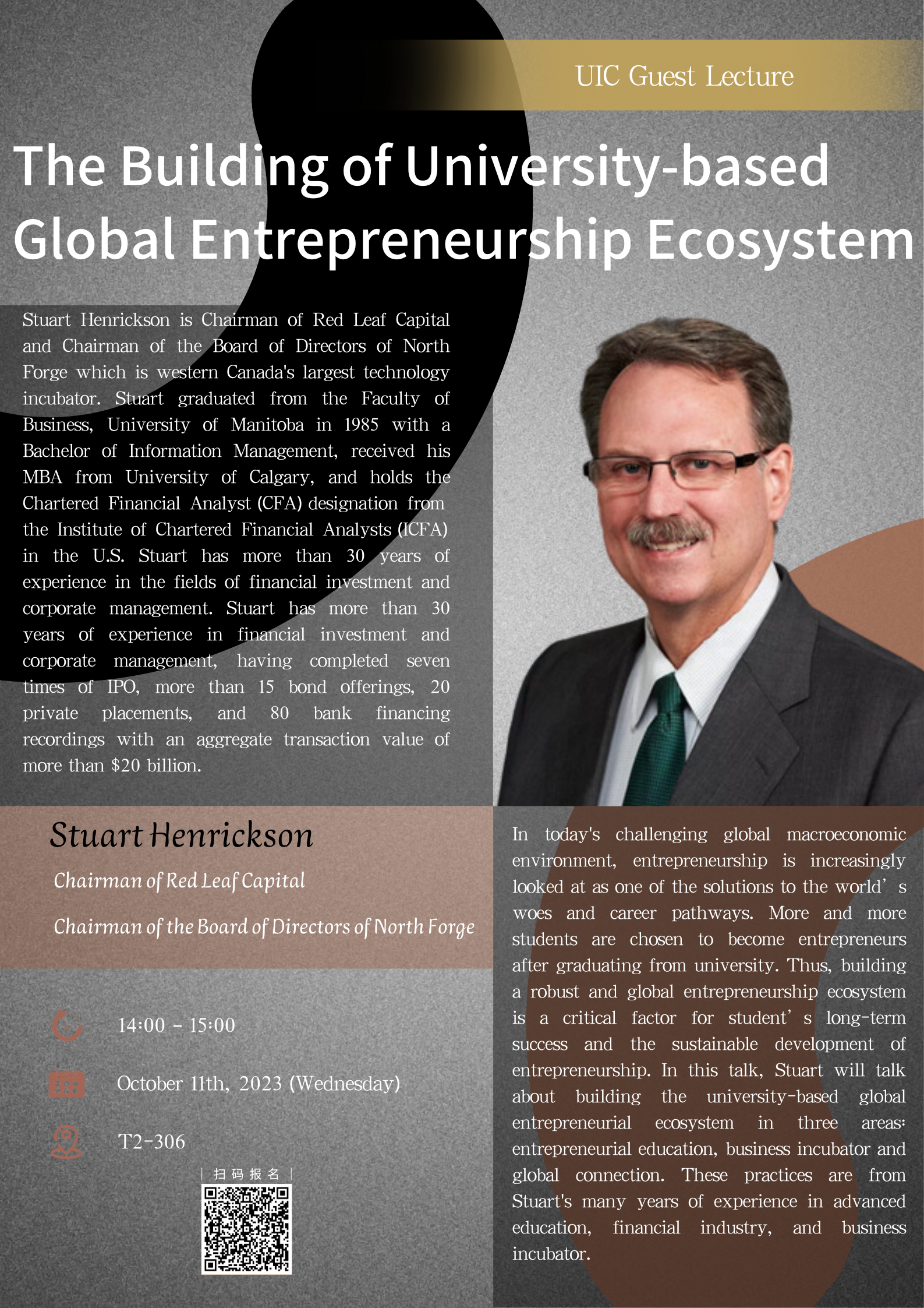 In today's challenging global macroeconomic environment, entrepreneurship is increasingly looked at as one of the solutions to the world’s woes and career pathways. More and more students are chosen to become entrepreneurs after graduating from university. Thus, building a robust and global entrepreneurship ecosystem is a critical factor for student’s long-term success and the sustainable development of entrepreneurship. In this talk, Stuart will talk about building the university-based global entrepreneurial ecosystem in three areas: entrepreneurial education, business incubator and global connection. These practices are from Stuart's many years of experience in advanced education, financial industry, and business incubator.