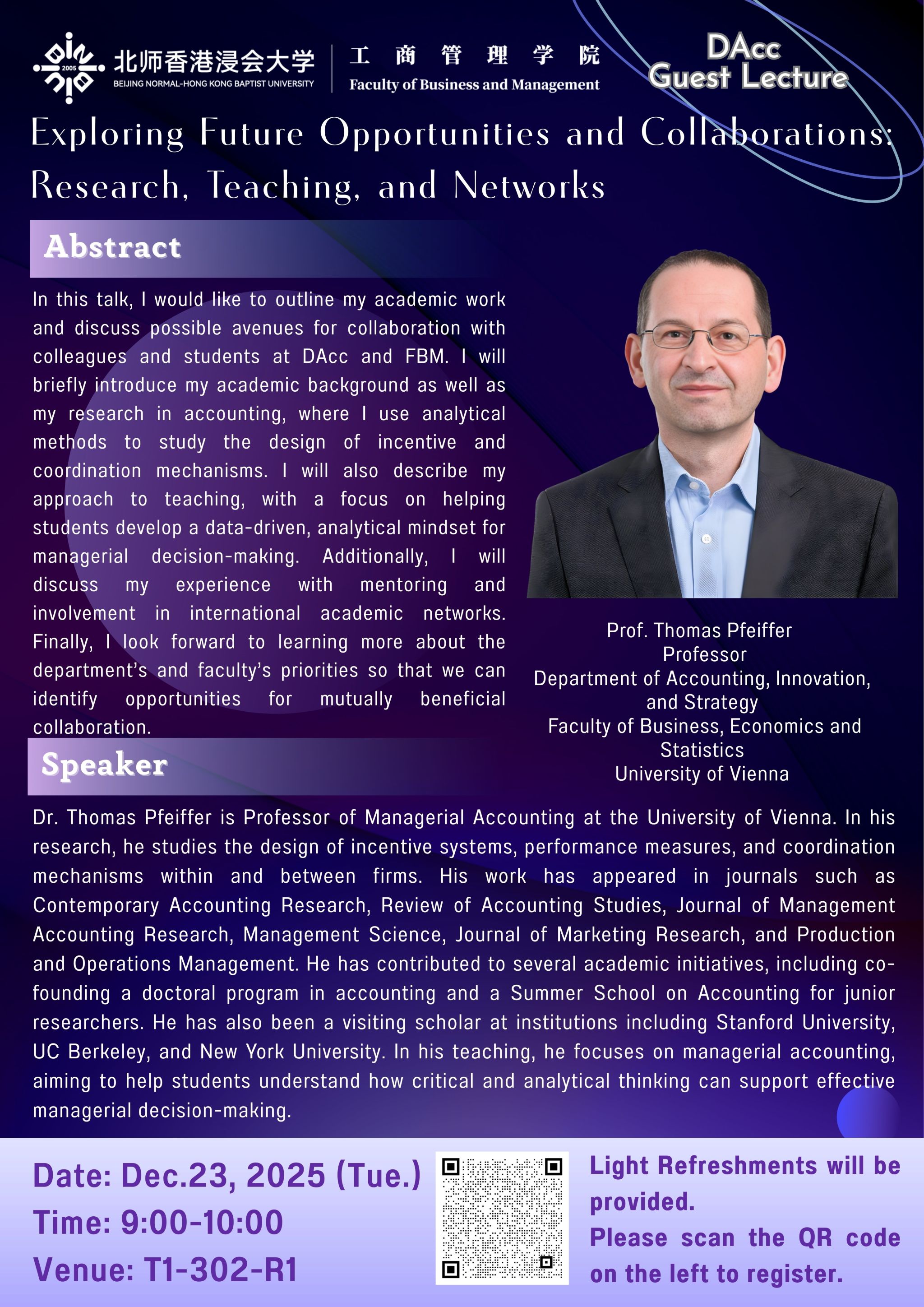 In this talk, I would like to outline my academic work and discuss possible avenues for collaboration with colleagues and students at DAcc and FBM. I will briefly introduce my academic background as well as my research in accounting, where I use analytical methods to study the design of incentive and coordination mechanisms. I will also describe my approach to teaching, with a focus on helping students develop a data-driven, analytical mindset for managerial decision-making. Additionally, I will discuss my experience with mentoring and involvement in international academic networks. Finally, I look forward to learning more about the department’s and faculty’s priorities so that we can identify opportunities for mutually beneficial collaboration.