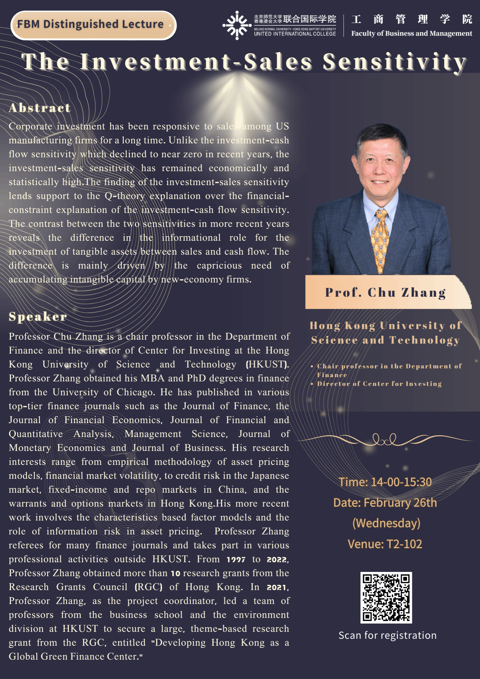 Professor Chu Zhangis a chair professor in the Department of Finance and the director of Centerfor Investing at the Hong Kong University of Science and Technology(HKUST).  Professor Zhang obtained hisMBA and PhD degrees in finance from the University of Chicago.  He has published in various top-tier financejournals such as the Journal of Finance, the Journal of Financial Economics,Journal of Financial and Quantitative Analysis, Management Science, Journal ofMonetary Economics and Journal of Business. His research interests range fromempirical methodology of asset pricing models, financial market volatility, tocredit risk in the Japanese market, fixed-income and repo markets in China, andthe warrants and options markets in Hong Kong.  His more recent work involves the characteristics based factor modelsand the role of information risk in asset pricing.   Professor Zhang referees for many financejournals and takes part in various professional activities outside HKUST.  From 1997 to 2022, Professor Zhang obtainedmore than 10 research grants from the Research Grants Council (RGC) of HongKong.  In 2021, Professor Zhang, as theproject coordinator, led a team of professors from the business school and theenvironment division at HKUST to secure a large, theme-based research grantfrom the RGC, entitled “Developing Hong Kong as a Global Green Finance Center.”