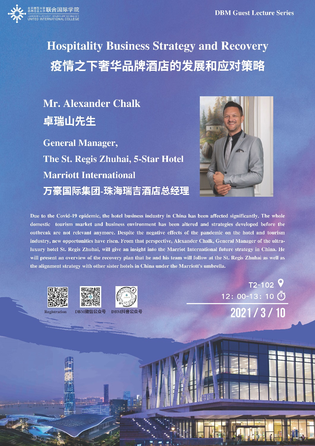 Due to the Covid-19 epidemic, the hotel business industry in China has been affected significantly. The whole domestic tourism market and business environment has been altered and strategies developed before the outbreak are not relevant anymore. Despite the negative effects of the pandemic on the hotel and tourism industry, new opportunities have risen. From that perspective, Alexander Chalk, General Manager of the ultra-luxury hotel St. Regis Zhuhai, will give an insight into the Marriot International future strategy in China. He will present an overview of the recovery plan that he and his team will follow at the St. Regis Zhuhai as well as the alignment strategy with other sister hotels in China under the Marriott`s umbrella.