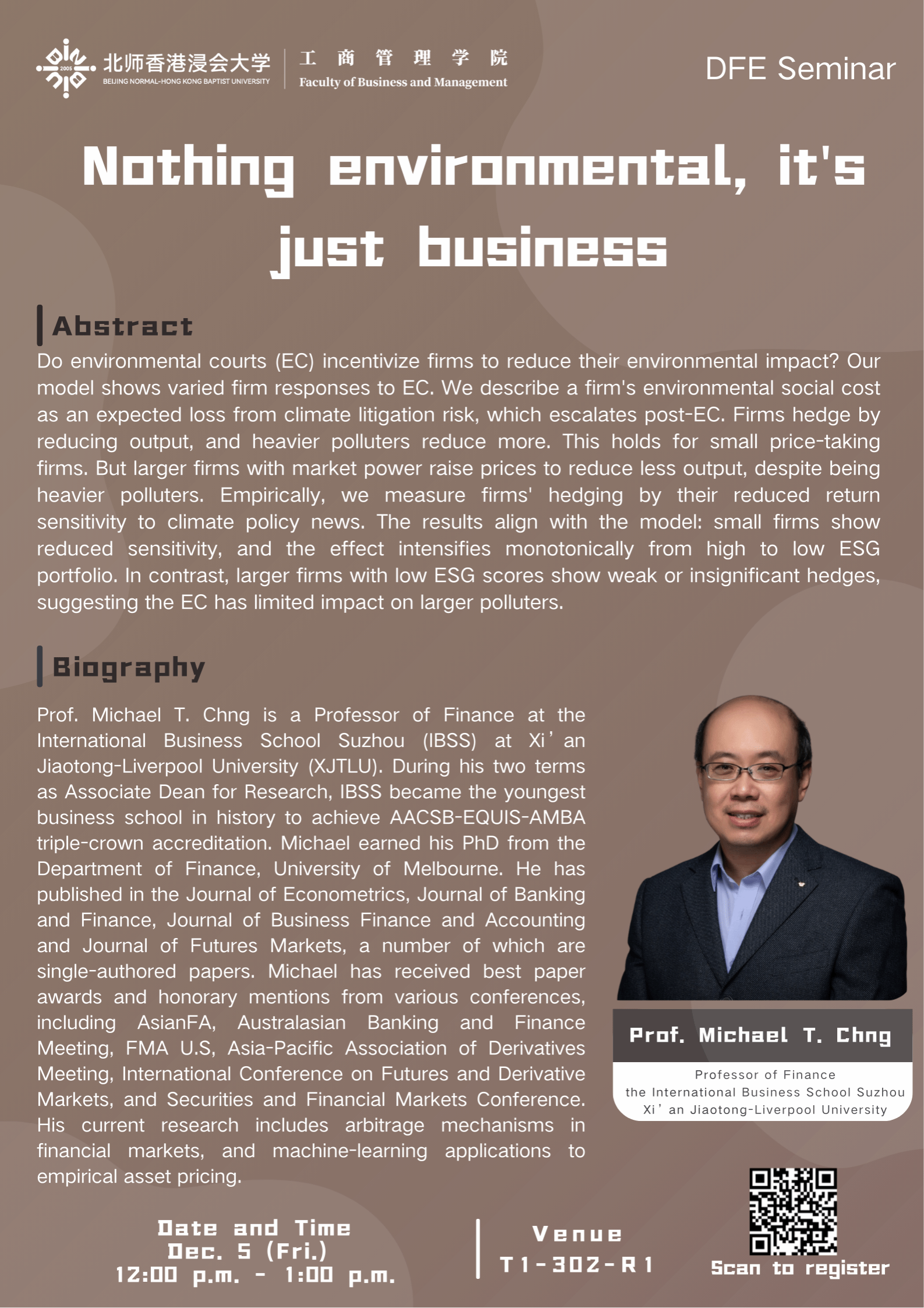 About the Speaker: Prof. Michael T. Chng is a Professor of Finance at the International Business School Suzhou (IBSS) at Xi’an Jiaotong-Liverpool University (XJTLU). During his two terms as Associate Dean for Research, IBSS became the youngest business school in history to achieve AACSB-EQUIS-AMBA triple-crown accreditation. Michael earned his PhD from the Department of Finance, University of Melbourne. He has published in the Journal of Econometrics, Journal of Banking and Finance, Journal of Business Finance and Accounting and Journal of Futures Markets, a number of which are single-authored papers. Michael has received best paper awards and honorary mentions from various conferences, including AsianFA, Australasian Banking and Finance Meeting, FMA U.S, Asia-Pacific Association of Derivatives Meeting, International Conference on Futures and Derivative Markets, and Securities and Financial Markets Conference. His current research includes arbitrage mechanisms in financial markets, and machine-learning applications to empirical asset pricing.