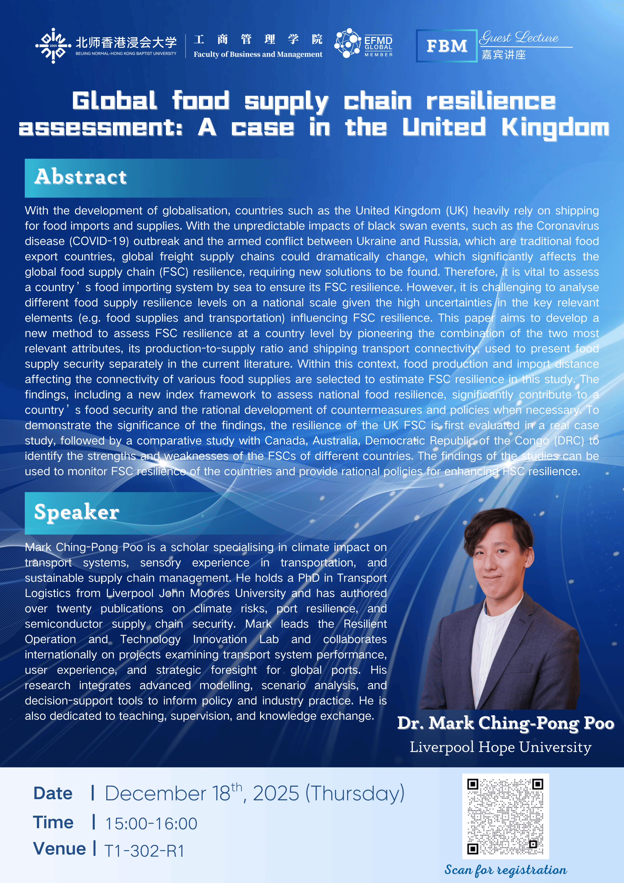 Mark Ching-Pong Poo is a scholar specialising in climate impact on transport systems, sensory experience in transportation, and sustainable supply chain management. He holds a PhD in Transport Logistics from Liverpool John Moores University and has authored over twenty publications on climate risks, port resilience, and semiconductor supply chain security. Mark leads the Resilient Operation and Technology Innovation Lab and collaborates internationally on projects examining transport system performance, user experience, and strategic foresight for global ports. His research integrates advanced modelling, scenario analysis, and decision-support tools to inform policy and industry practice. He is also dedicated to teaching, supervision, and knowledge exchange.