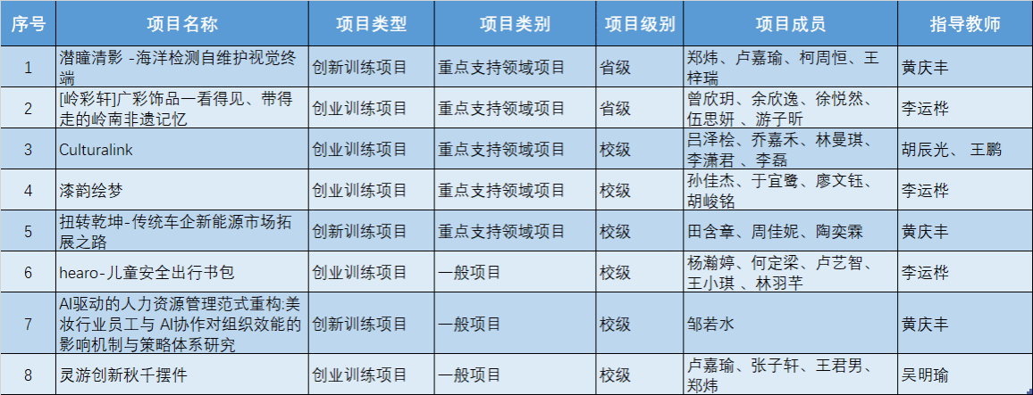 近日,北师香港浸会大学正式公布了2025年度大学生创新创业训练计划(以下简称"大创计划")立项及结题验收结果。工商管理学院在本年度表现亮眼,共有8个优质项目成功获得立项,其中包括2项省级重点支持项目和6项校级项目,充分展现了学院学子在创新创业领域的潜力与活力。另外,由何晴昊同学带领的“声声伴”创业训练项目顺利通过年度结题验收。该项目专注于声音陪伴产品的开发与商业模式验证,经过一年的努力,圆满完成了结题,为学院的大创计划增添了一份成果。这些成果不仅体现了工商管理学院在创新创业教育方面的成效,也彰显了BNBU"博雅教育、全人发展"办学理念的实践成果。从立项项目的领域分布来看,既有关注海洋生态保护的科技创新项目,也有传承岭南非遗文化的创业项目,充分展现了同学们多元化的创新视角和社会责任感。这些项目的顺利开展,将为学院培养更多具有创新精神和实践能力的复合型人才奠定坚实基础。