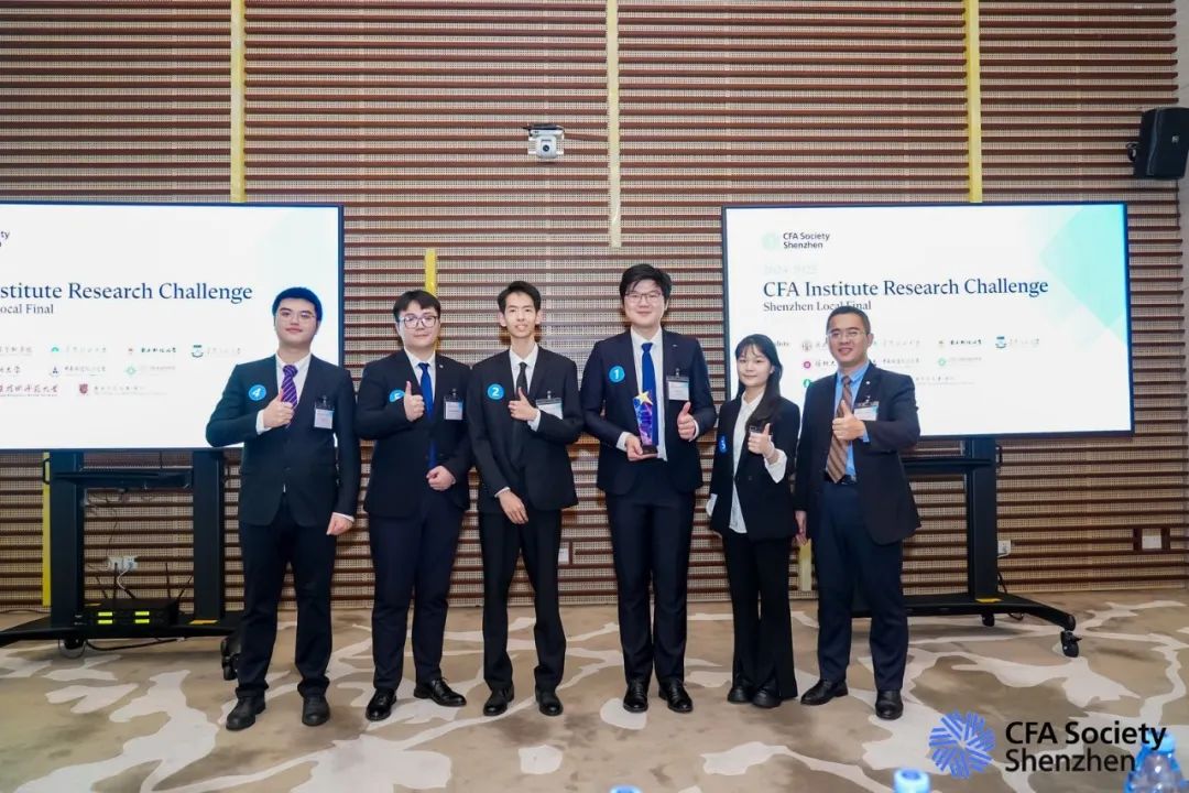聂子阳同学与队友在2024-25年CFA全球投资分析大赛获华南赛区冠军、成员们与指导老师财务学肖何博士合照