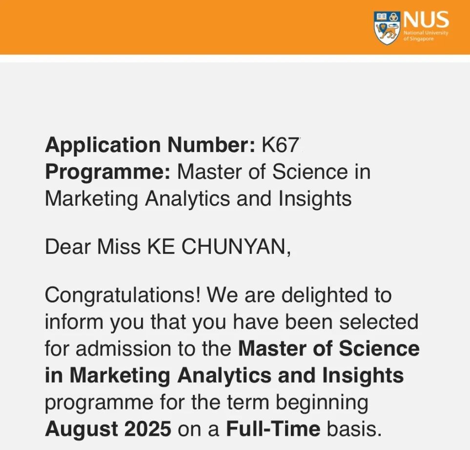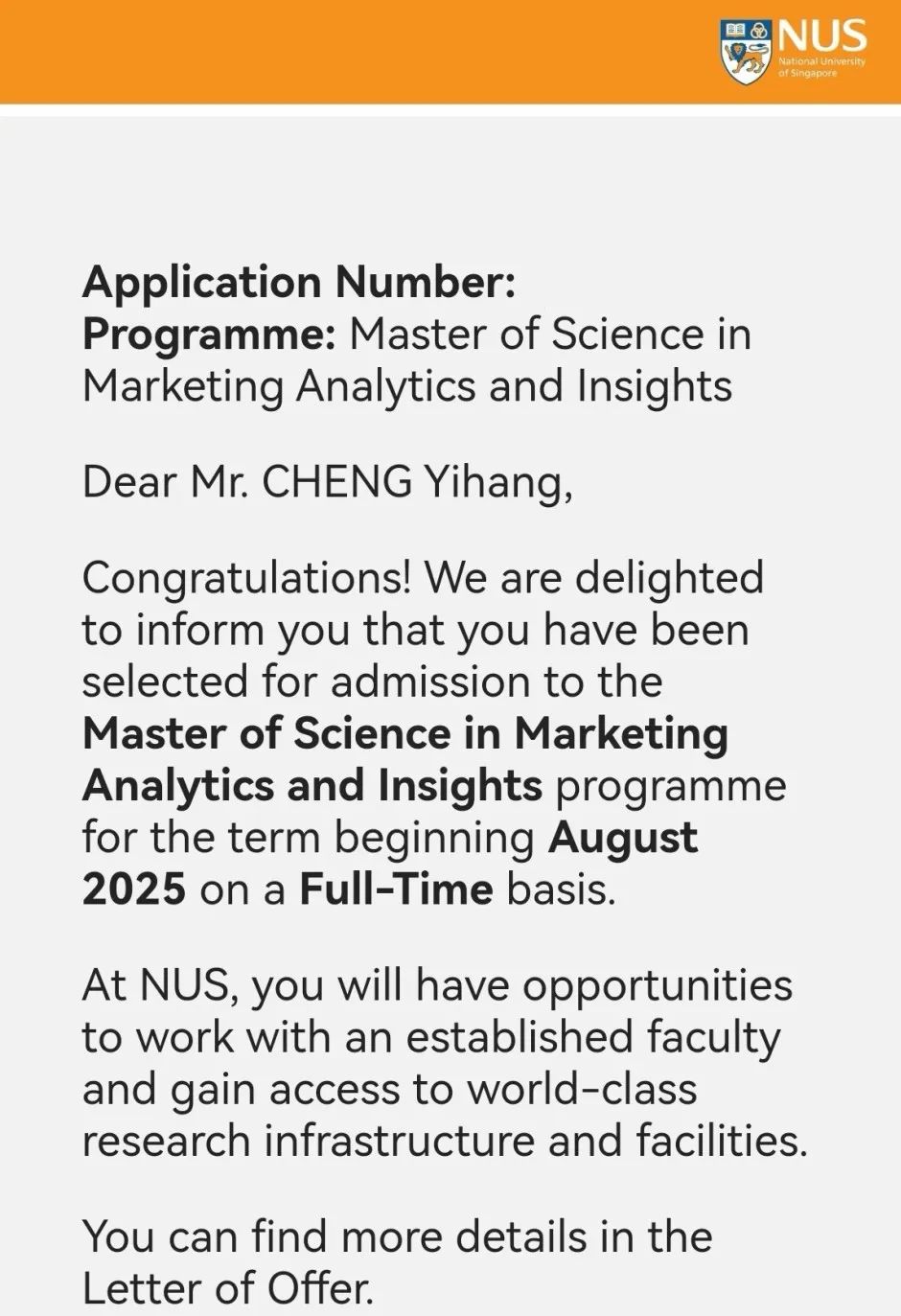 2025届市场营销管理毕业生今年共斩获7份新加坡国立大学offer!其中4份集中在 “市场营销分析与洞察”硕士项目,程一航/何青妍/柯春妍/吴梓瑄组团出发。这不仅体现了同学们在营销领域纵深发展的强烈意愿,更是世界顶尖学府对本专业学子实力的高度认可!