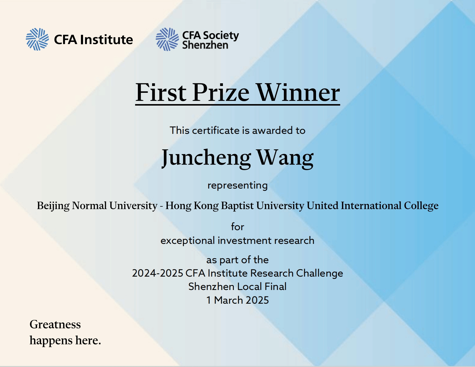 虽然这门课程难度较高,但通过不断努力、主动向老师请教和团队间的深入讨论,我不仅顺利完成了项目,还收获了宝贵的实战经验。更重要的是,这门课所培养的能力在我后续的发展中发挥了重要作用——它不仅帮助我获得了在招商证券的实习机会,也在CFA华南地区比赛中助我所在的团队摘得桂冠。