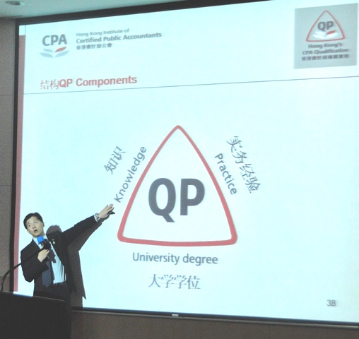 在成为注册会计师之路这一部分,伍先生向同学们介绍了会计专业资格要求,注册会计师准入资格要求,并提到内地首个QP资源中心就建在UIC,鼓励有兴趣的同学多去里面查看资料并咨询相关问题。