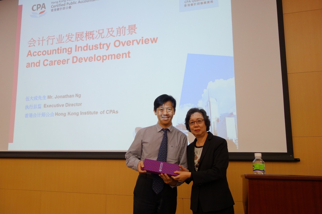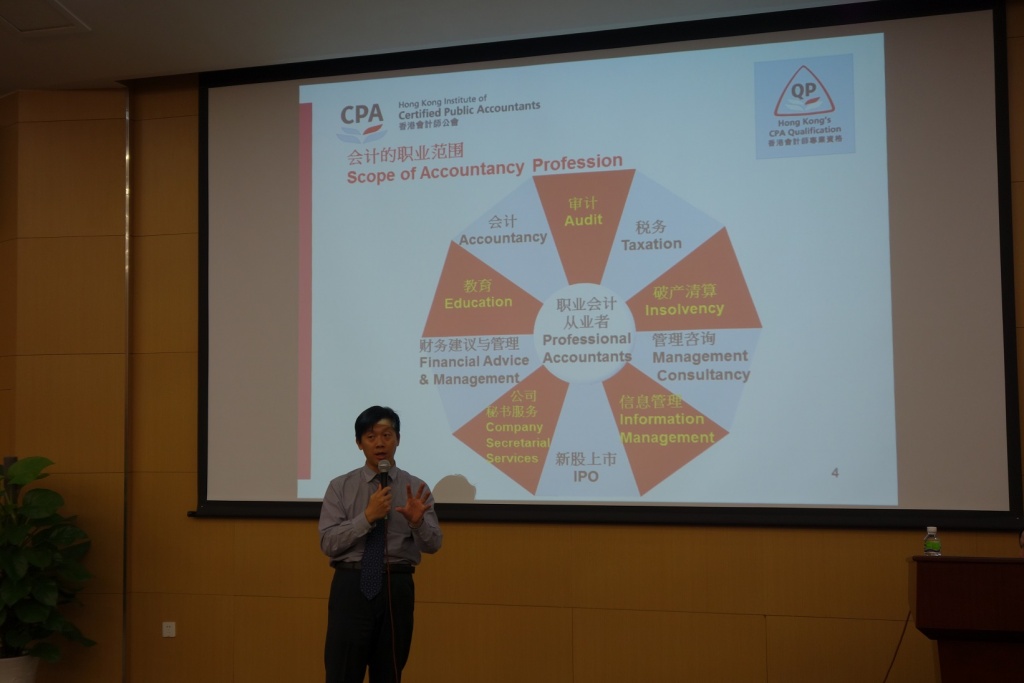 2015年10月14日,香港会计师公会(简称HKICPA)执行总监伍大成先生在新文化小镇给工商管理学部的同学带来了“会计行业发展概况及前景”的讲座。讲座涉及会计行业发展概况、成为注册会计师之路和专业资格课程(简称QP)的优势等,超过200多名工商管理学部的学生前去倾听,详实的内容对有志从事会计行业的同学大有裨益。