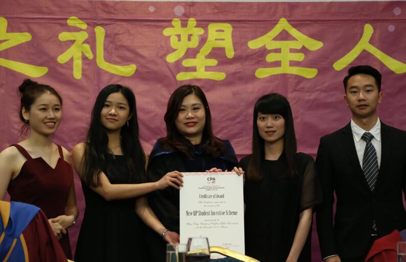 陈美宝会长向QP迎新奖励计划奖学金的大四会计同学:伍宣臻、林钰铭、钟博康、王莹颁发证书