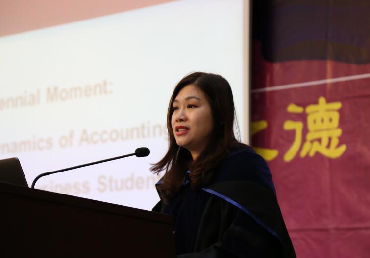 香港会计师公会会长陈美宝女士于4月21日作客UIC工商管理学部高桌晚宴,以“在千禧时代,以工商学生的角度纵观会计动态变化”为主题,与150多名大一学生分享会计行业的发展趋势。
