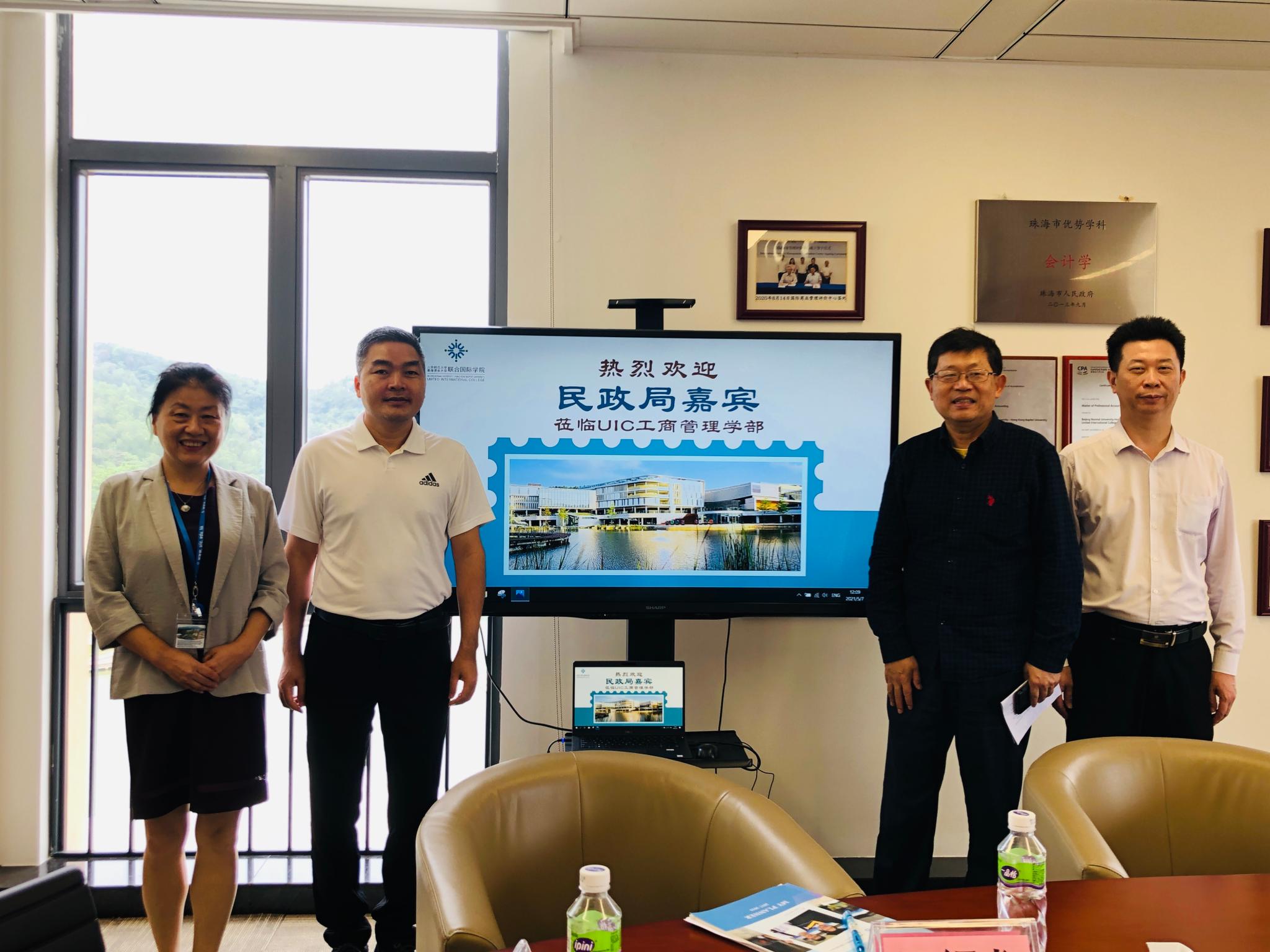 从左至右:UIC党委副书记王红同志、民政局杨海副局长、UIC工商管理学部院长刘文斌教授、民政局林文涌科长