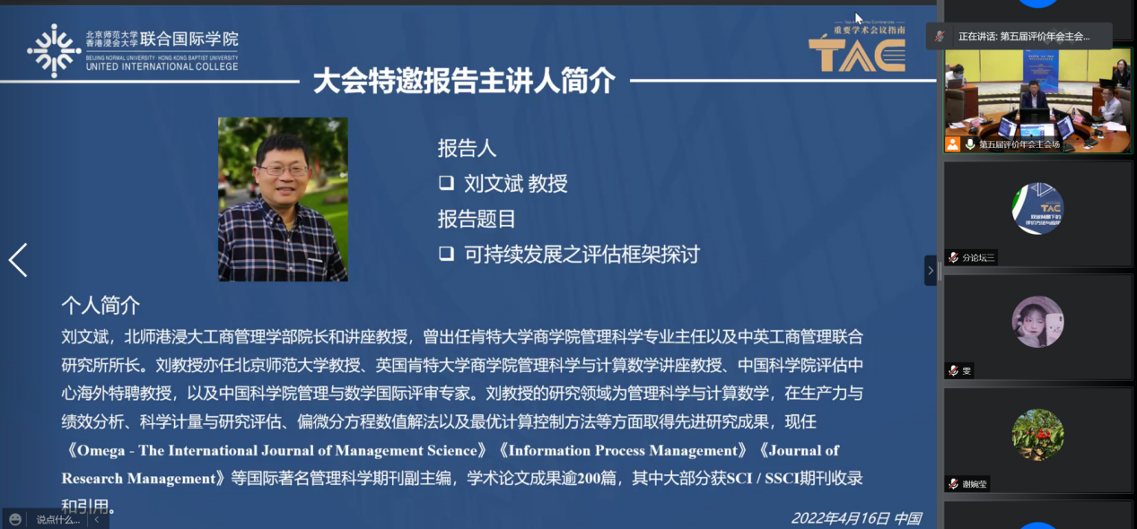 2022年4月16日,由中国优选法统筹法与经济数学研究会(‘双法’)评价方法与应用分会主办,北京师范大学-香港浸会大学联合国际学院(中文简称“北师港浸大”,英文简称“UIC”)、中国科学院管理创新与评估研究中心、北京师范大学珠海校区评估研究中心承办的“第五届中国双法研究会评价方法与应用分会年会”在云端顺利召开。中国“双法”研究会理事长池宏研究员、北师港浸大(UIC)黄华雄副校长和中国“双法”评价方法与应用分会理事长李晓轩研究员分别致开幕辞,北师港浸大(UIC)工商管理学部院长刘文斌教授主持开幕式。本届会议主题是“双碳背景下的评价方法与应用”,设有大会邀请报告、分论坛报告等环节。会议得到了评价领域学者们特别是青年学者的热烈响应,来自全国各地高校、科研机构的200余名学者在线参加了会议。