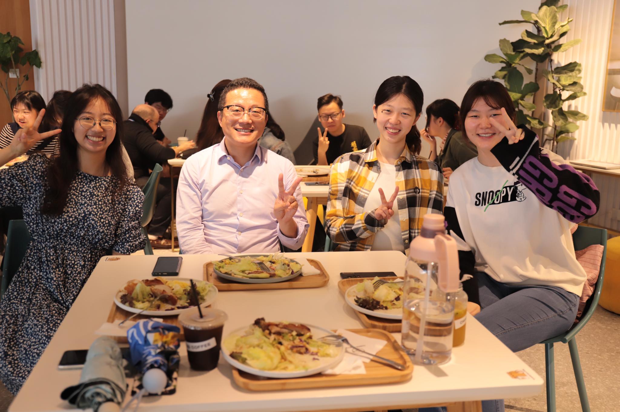 学生在阅读周期间与翁祉泉博士(左二)约饭交流