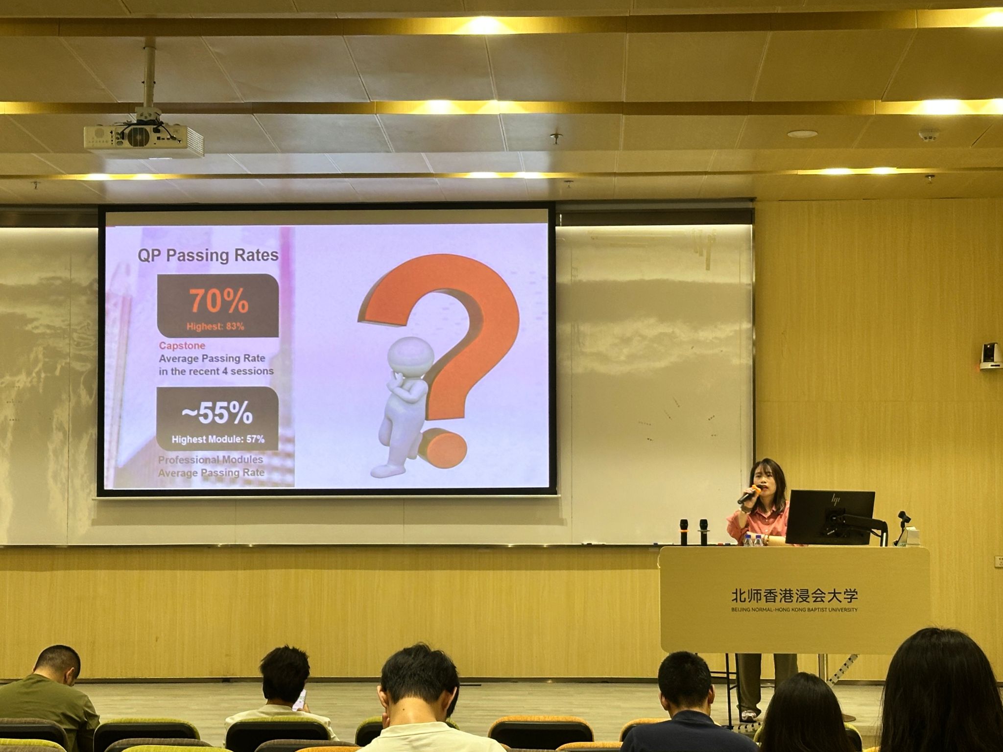 针对BNBU学生的实际情况,李莹女士特别强调了十门课程豁免政策及CAB证书(会计与商业证书)。符合条件的学生可申请最多十门QP课程的豁免,从而大幅缩短考试周期。同时,她介绍,学生在完成8门基础课程及2门专业课程后,即可获得CAB证书,为后续QP学习打下坚实基础,亦有助于提升个人专业竞争力。此外,她还指出,HKICPA为考生提供系统化的学习支持为学生提供助力,帮助其高效备考。