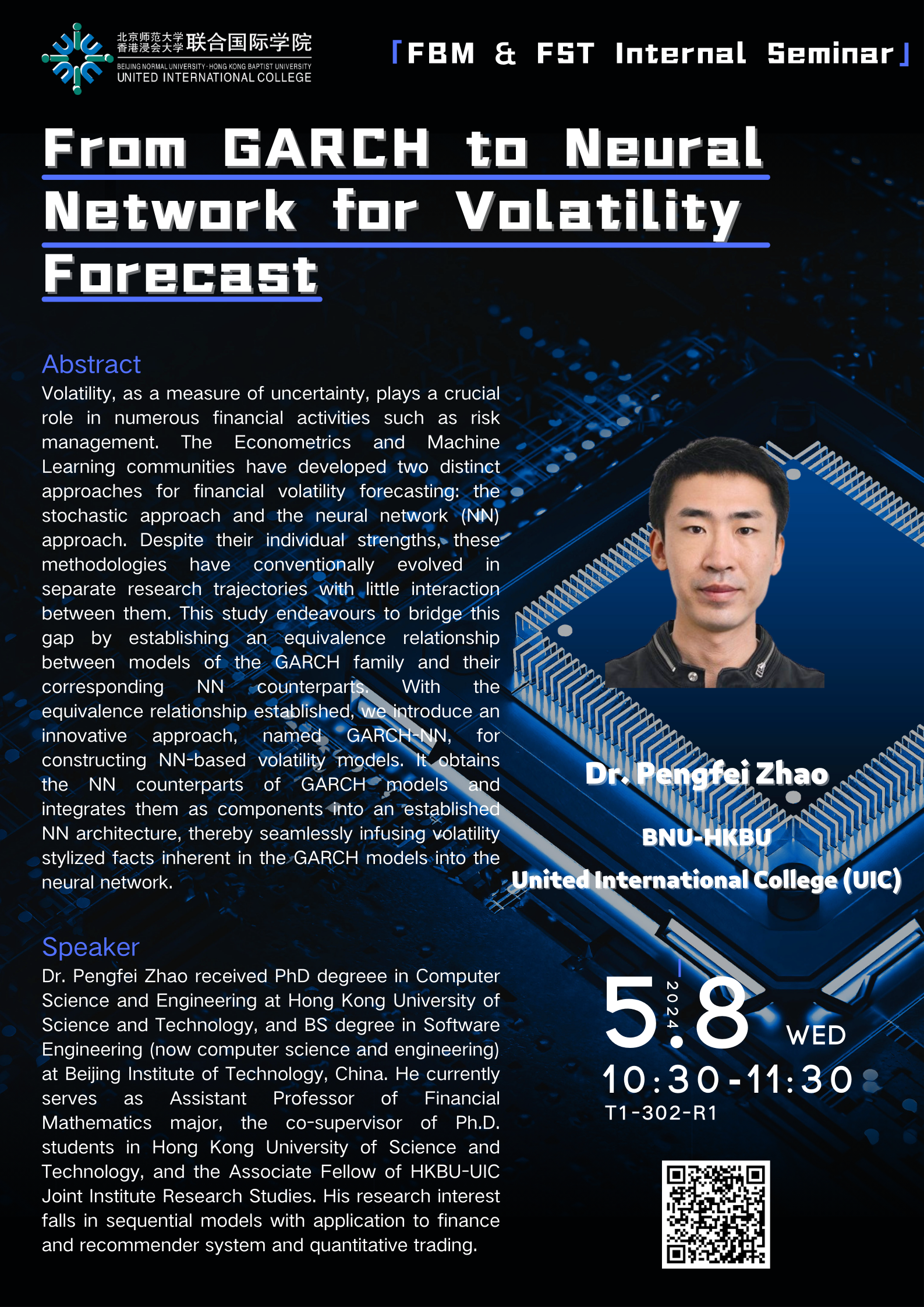赵鹏飞博士在香港科技大学获得计算机科学与工程博士学位,在此之前,在北京理工大学获得软件工程学士学位。他目前担任金融数学专业助理教授、香港科技大学博士生协同导师,并且是香港浸会大学-UIC联合研究所副研究员。他的研究兴趣是将序列模型应用于金融、推荐系统和量化交易。