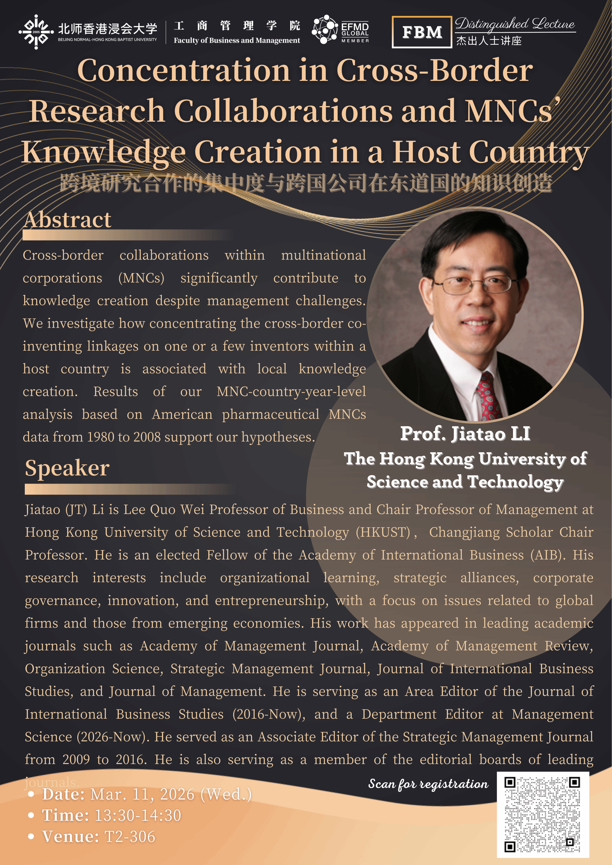 李家涛教授还是国际商业战略的资深专家,致力于推进新兴国家的企业战略研究。他目前担任管理学顶尖期刊 Management Science (MS) 战略部主编(Department Editor)(2026- 至今),国际商务顶尖期刊Journal of International Business Studies (JIBS)副主编(2016-至今),并于2009-2016期间担任战略管理顶尖期刊Strategic Management Journal (SMJ)的副主编。李家涛教授曾于2013年7月-2017年7月任科大商学院资深副院长, 2009年-2013年7月任科大商学院副院长,2006-2017年8月任科大商学院管理学系系主任。