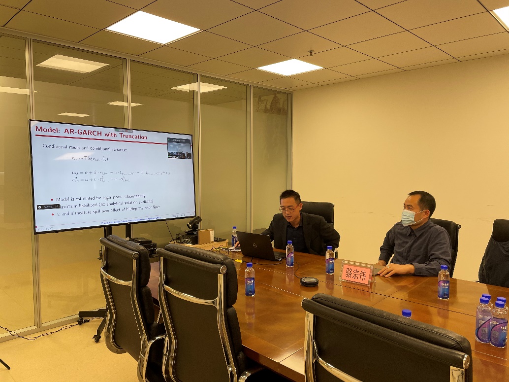 第一位主讲人为北师港浸大助理教授胡瑜加博士,胡博士的报告题目为:Price Limits in the Chinese Financial Markets and Spillover,该报告主要介绍了围绕股票限价政策提出了一个建模参数,能够捕捉到(有限的)价格数据生成过程,捕捉到动态波动和市场相关性,以及价格达到极限后风险和收益的溢出效应。该模型规格是基于具有条件相关性的截断正态GARCH参数化,这在中国金融市场的建模文献中是新的。模型估计值可用于形成交易策略和投资组合风险评估。