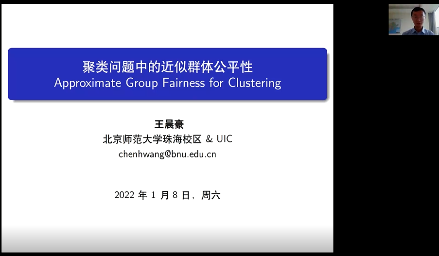 最后一位主讲人为来自北京师范大学珠海校区和北师港浸大的王晨豪博士,王博士的报告题目为:聚类问题中的近似群体公平性(Approximate Group Fairness for Clustering)。本报告主要围绕如何定义公平和如何设计有效的算法来保证公平性来展开。