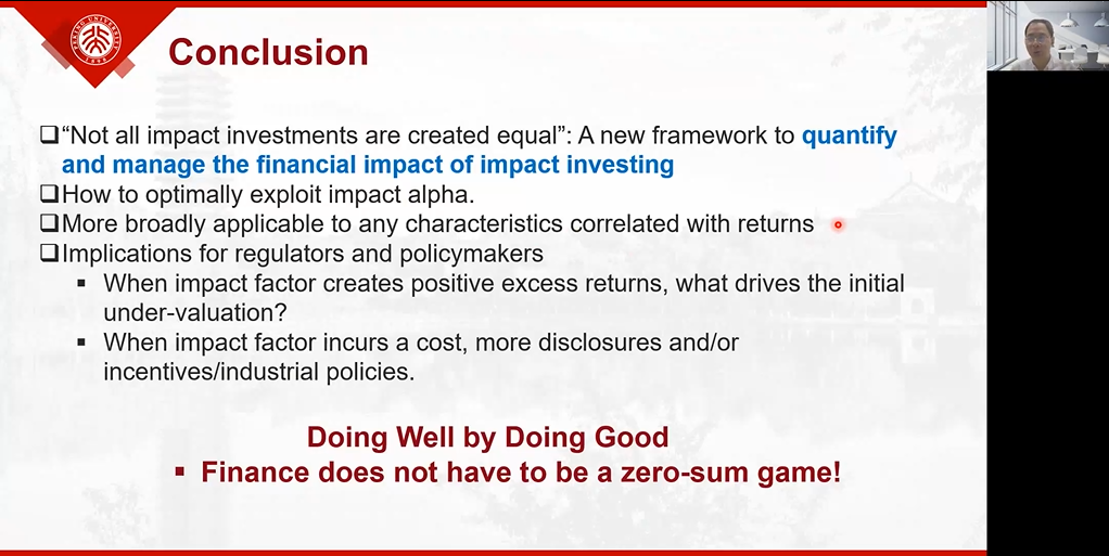 第二位报告嘉宾是来自北京大学的张瑞勋博士。张瑞勋博士是北京大学数学科学学院金融数学系研究员、博雅青年学者。他的主要研究兴趣包括金融科技,可持续投资,适应性市场理论,以及金融和人工智能交叉领域。张瑞勋博士为大家带来了“Quantifying the Impact of Impact Investing”的报告。