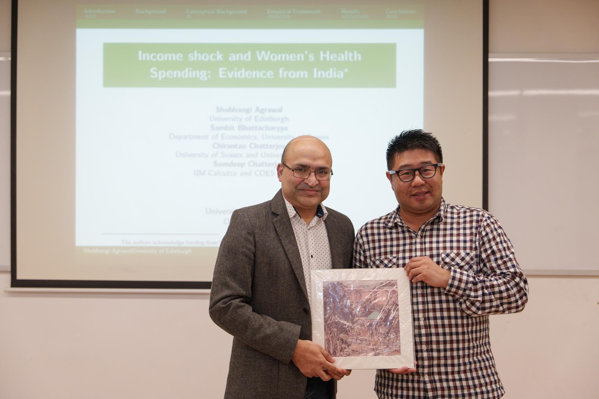 在研讨会上,他分享了他的研究团队关于印度女性收入与健康支出的最新研究成果。传统观点认为,医疗保健开支会随着GDP的增长而增加,但在印度,尽管经济正在快速扩张,全国的医疗保健总支出却在下降。Bhattacharyya教授的团队试图探索这一现象背后的潜在原因。他们使用2016-2020年印度的家庭收入与医疗数据发现,当女性主导的家庭的公积金支出减少、从而导致其家庭可支配收入增加时,其家庭医疗支出不仅没有增加、反而减少了,即使控制了其健康状态后依然如此。他们认为,这可能是由于社会习俗的影响,导致女性在收入增加后,其支出偏好发生了变化:将更多的可支配收入用于其它家庭公共开支而非医疗支出。因此,其研究揭示了社会习俗与支出偏好的动态变化对医疗支出的可能影响。