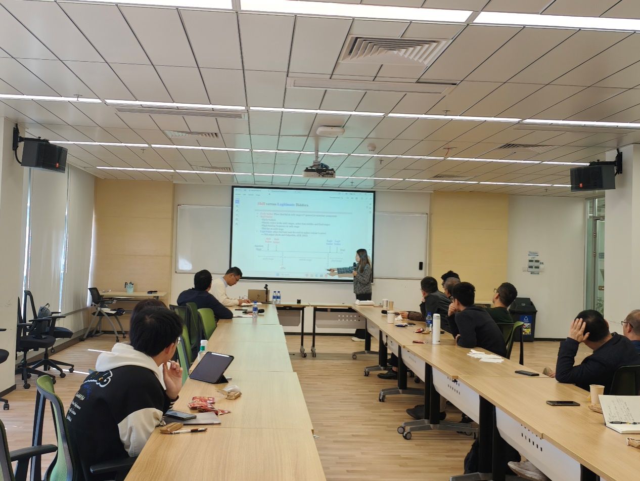 在本次讲座中,胡荣博士展示了她的团队对中国法院拍卖房产(法拍房)的研究成果,其主要通过统计分析拍卖中潜在买家的出价行为以及其对最终拍卖价格的影响。他们的研究揭示了样本中2%的参与者被怀疑是虚假出价者,8%的拍卖活动涉及到这种行为。通过匹配样本的方法,他们证明了虚假出价者的存在导致了价格溢价显著增加8.2%。