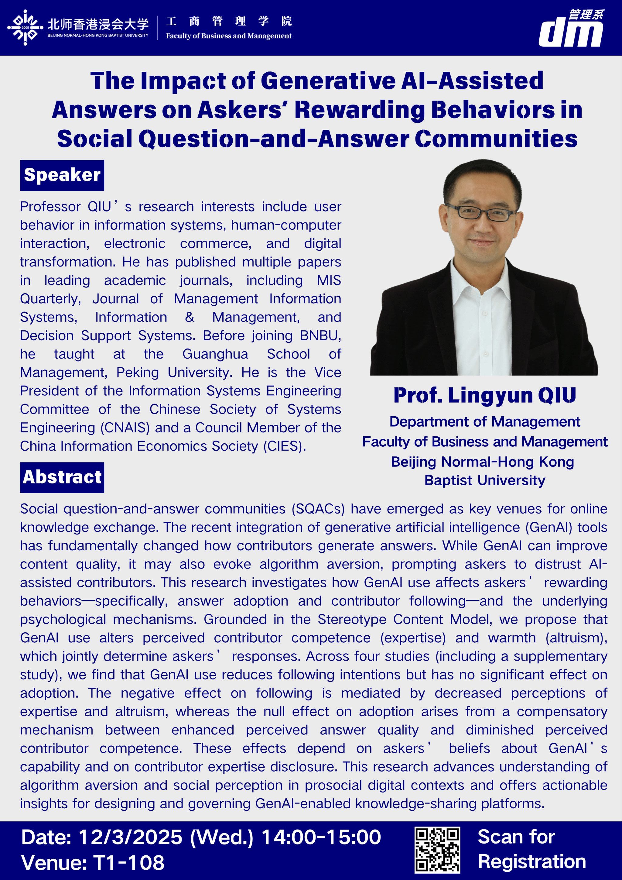 讲座题目:The Impact of Generative AI–Assisted Answers on Askers’ Rewarding Behaviors in Social Question-and-Answer Communities