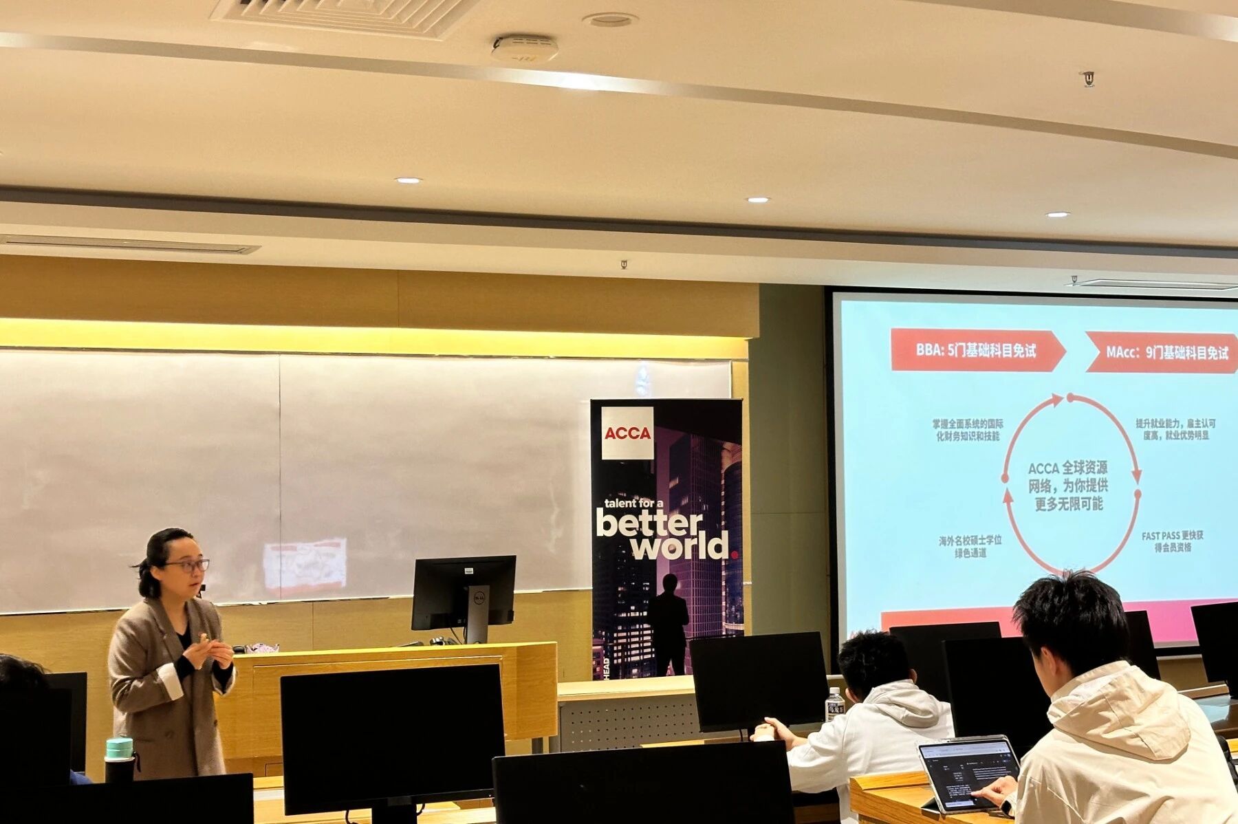 讲座最后,来自 ACCA华南教育关系主任吴敏航女士介绍了 ACCA 的全球化背景与专业价值。ACCA 目前在 180 多个国家和地区拥有会员及学员,与全球四大会计师事务所、大型跨国企业、金融机构深度合作,是国际财务人才最具认可度的资格之一。吴女士也向同学们解读了免试政策及学习路径,帮助大家更清晰地规划未来专业发展。