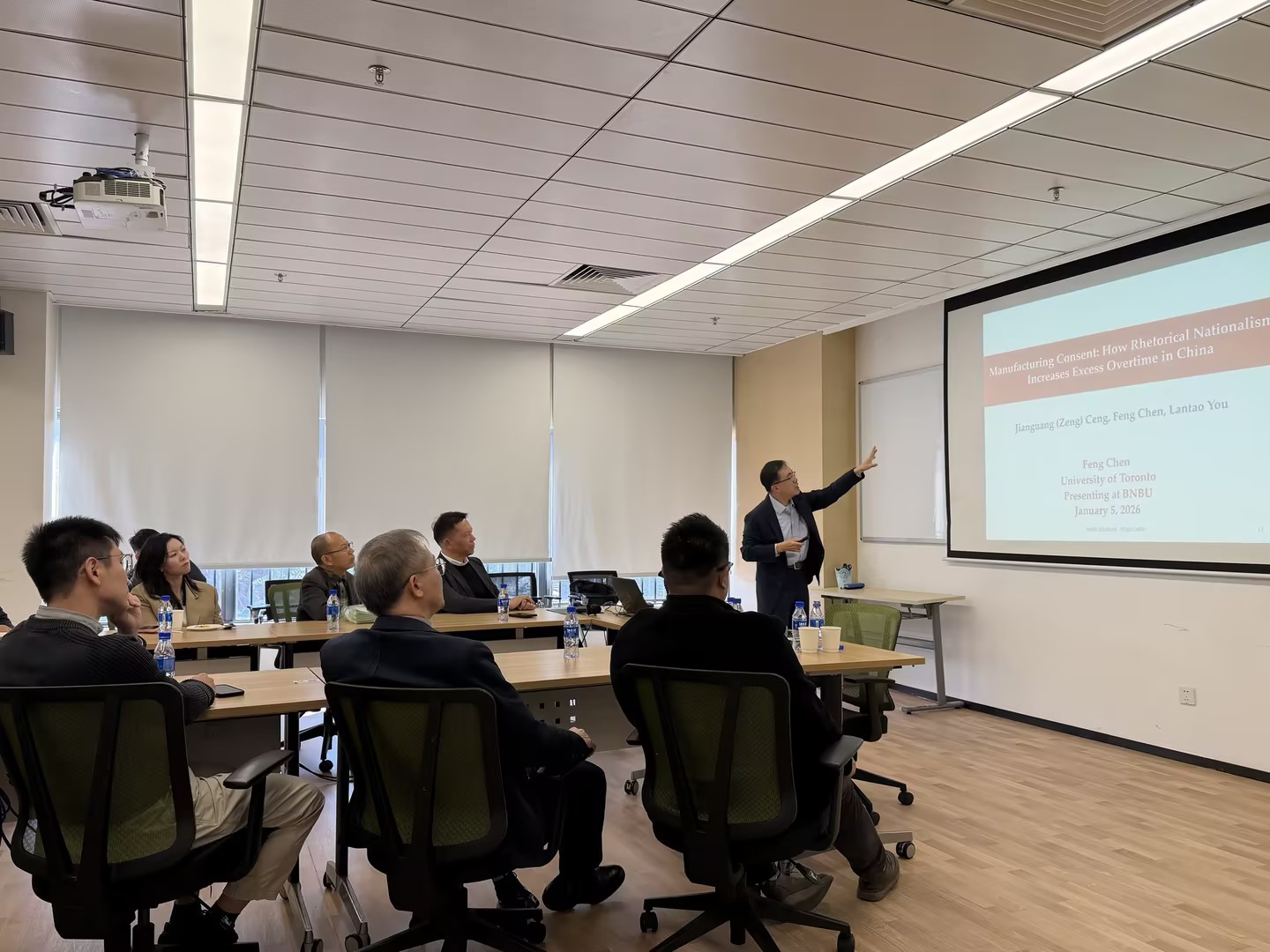 2026年1月5日下午2点至3点,工商管理学院在T1-302-R1成功举办了一场主题为“制造同意:修辞性民族主义如何导致中国企业过度加班”的精彩学术讲座。本次讲座由来自多伦多大学的陈峰博士主讲,吸引了众多师生的热情参与。