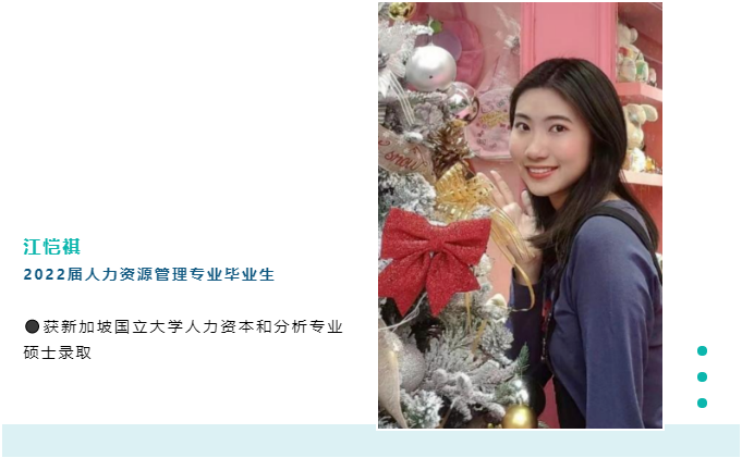 在专业必修课“组织行为学”的课上,通过和老师沟通,江恺祺萌生了对社会心理学的兴趣。在后续的自由选修课中,她选修了“心理学导论”“组织应用社会心理学”等课程,进一步加深心理学领域的学习。