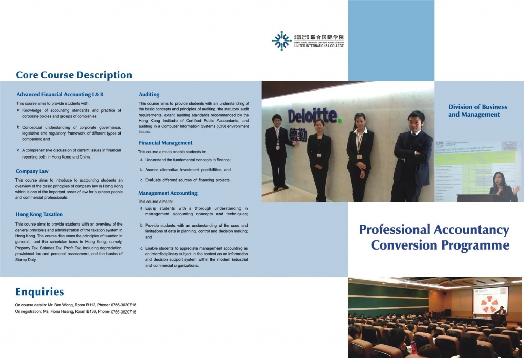 Ealier this year, UIC has obtained the accreditation of a Professional Accountancy Conversion Programme from the Hong Kong Institute of Certified Public Accountants (HKICPA). The programme is specifically designed for Non-Accounting Business students and Non-Business students that aspire to pursue an international professional accountancy qualification, such as the HKICPA CPA qualification, after graduation from your bachelor degree at UIC. This is a Certificate Programme and students are required to study and complete six subjects in two summer sessions.