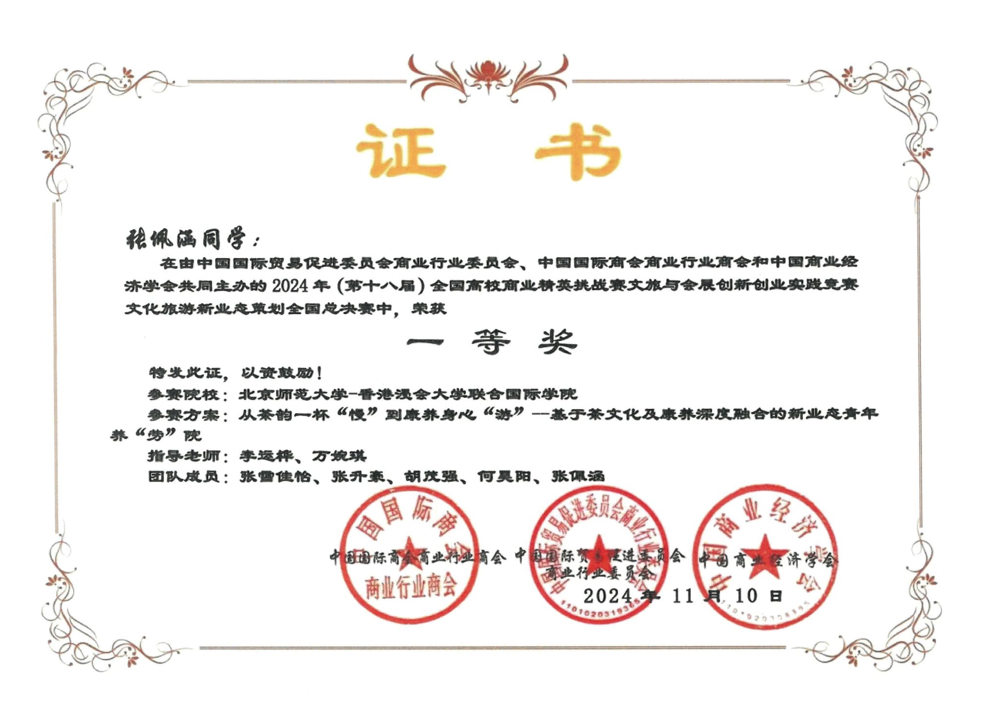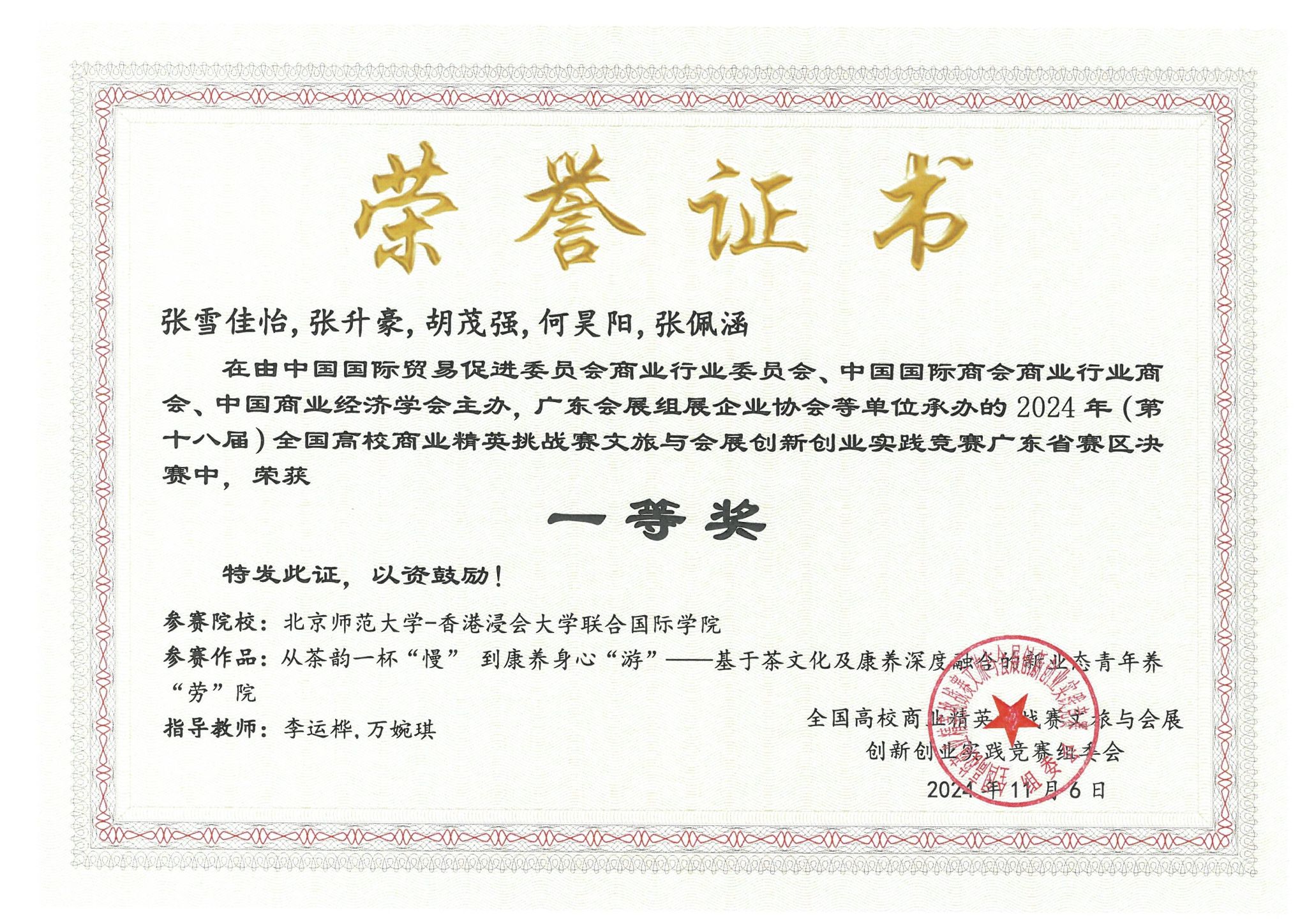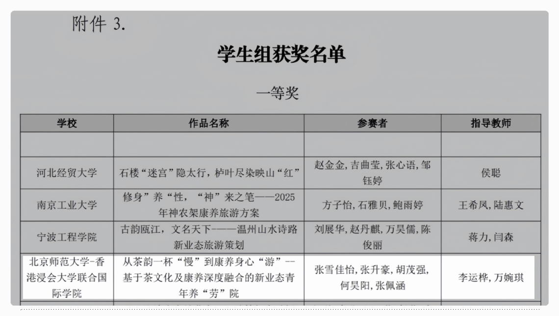 BNBU的旅游新业态团队由来自工商管理学院市场营销管理专业的张雪佳怡、张升豪、胡茂强,公共关系与广告学的何昊阳,以及文化与创意管理专业的张佩涵组成。他们在备赛过程中全身心投入,不断优化方案,面对复杂的竞争环境始终坚持不懈。指导老师们提供了精准的方向指引和专业辅导,从剖析赛题到模拟演练,全程陪伴学生攻克难题。团队完成的《从茶韵一杯“慢”到康养身心“游”基于茶文化及康养深度融合的新业态青年养“劳”院》在比赛中脱颖而出,凭借创新思维、扎实的专业知识和出色的团队协作能力,在广东省赛中获得一等奖,晋级全国总决赛。在全国总决赛中,他们凭借对文旅与会展行业的敏锐洞察力和独特创意,再次获得一等奖!