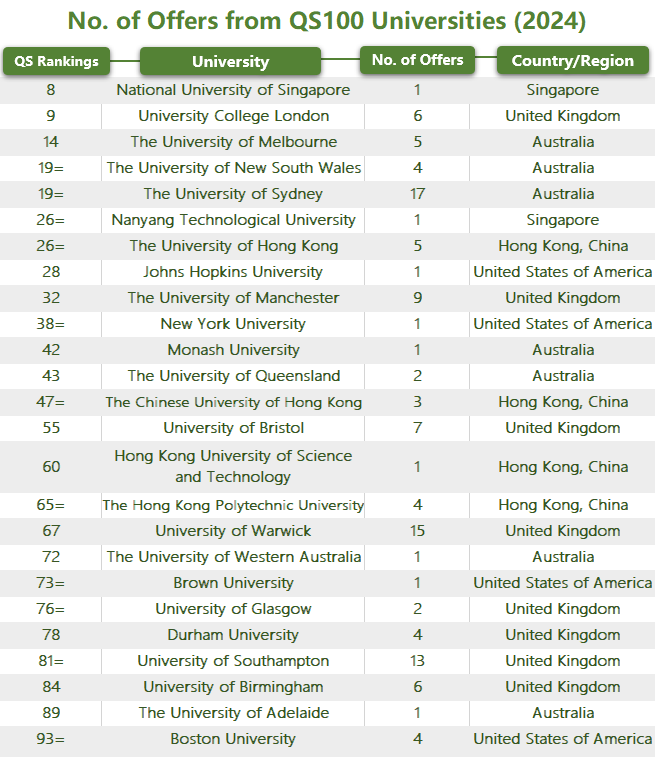 The Class of 2024 achieved a QS30 (world's top 30 universities) admission rate of 41%, a significant 16-percentage-point increase year-on-year and a new program record. The QS100 admission rate stands at 82%. Students pursuing further studies received a total of 115 postgraduate offers, averaging 3 QS100 offers per person.