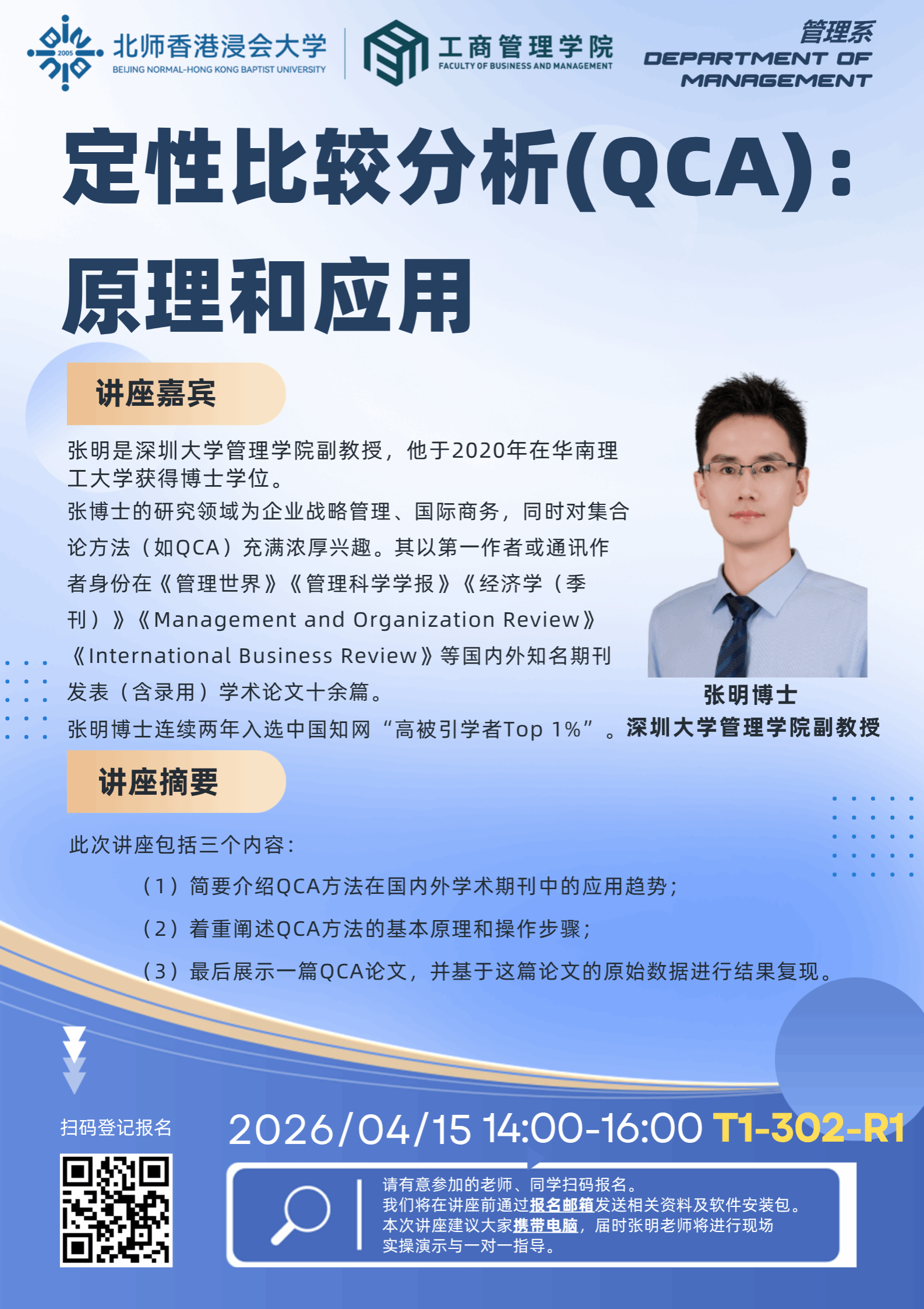 Dr. Ming Zhang is an Associate Professor at the School of Management, Shenzhen University. He received his PhD from South China University of Technology in 2020. Dr. Zhang’s research interests focuses on corporate strategic management and international business, with a strong interest in set-theoretic methods such as Qualitative Comparative Analysis (QCA). He has published over ten academic papers as the first author or corresponding author in renowned domestic and international journals, including Journal of Management World (管理世界), Journal of Management Science in China (管理科学学报), China Economic Quarterly (经济学(季刊)), Management and Organization Review, and International Business Review. For two consecutive years, Dr. Zhang has been recognized as among the "Top 1% Most Cited Scholars" by the China National Knowledge Infrastructure (CNKI).